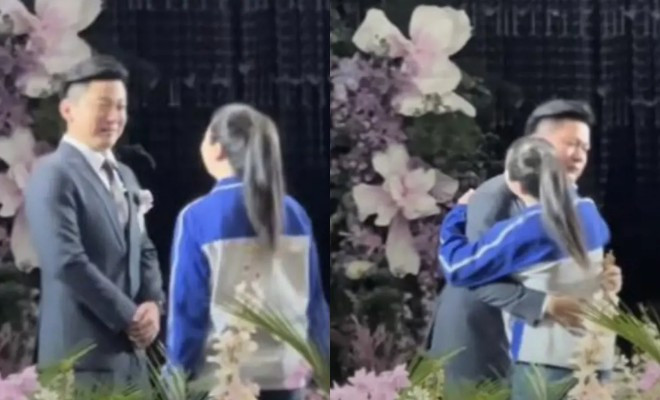 Video lan truyền trên mạng xã hội cho thấy từ lối vào sảnh cưới, cô dâu mặc đồng phục học sinh, bước chầm chậm về phía chú rể. Khi đến gần anh, cô chạm nhẹ vào lưng.