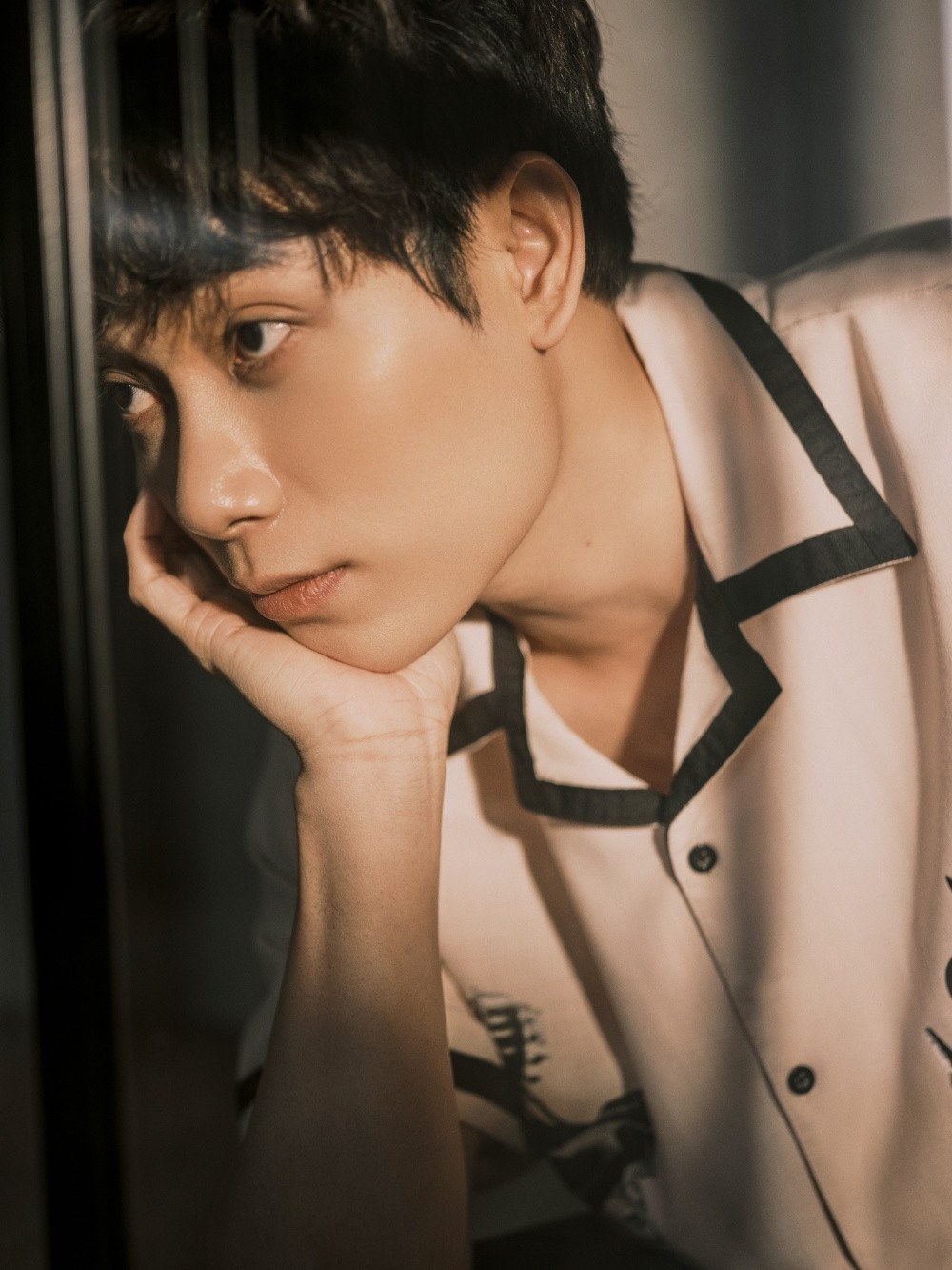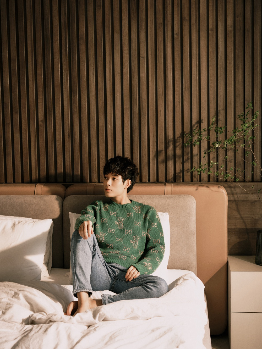Trúc Nhân khác lạ với mái tóc xoăn phong cách lãng tử. Anh diện sơ mi tay dài, sơ mi họa tiết và sweater len họa tiết màu lạnh. Thay cho phong cách vui tươi và trẻ trung thường lệ, ca sĩ thể hiện thần thái điềm đạm, chững chạc.