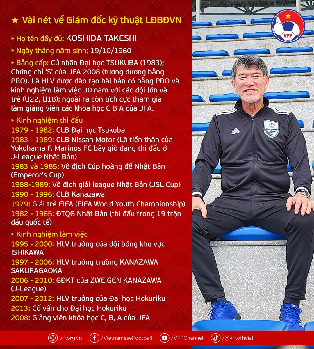 Ông Koshida Takeshi sinh năm 1960, là ứng cử viên do Ban chuyên môn của LĐBĐ Nhật Bản tiến cử. Ông là một chuyên gia bóng đá được đào tạo bài bản với bằng HLV Pro, có bề dày kinh nghiệm 30 năm làm việc với các đội tuyển lớn cũng như đội trẻ.