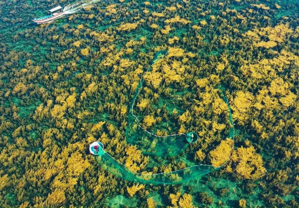 Nếu check-in vào mùa mùa rong, màu sắc rong mơ cũng sẽ tùy từng thời điểm mà thay đổi từ nâu sang cam, vàng... Phóng tầm mắt từ trên cao nhìn xuống, ai cũng sẽ ngỡ ngàng bởi vẻ đẹp tựa tranh vẽ của mặt biển trong xanh xen lẫn màu vàng nâu của những đám rong mơ ngoi mình lên mặt nước, đu đưa theo dòng chảy.