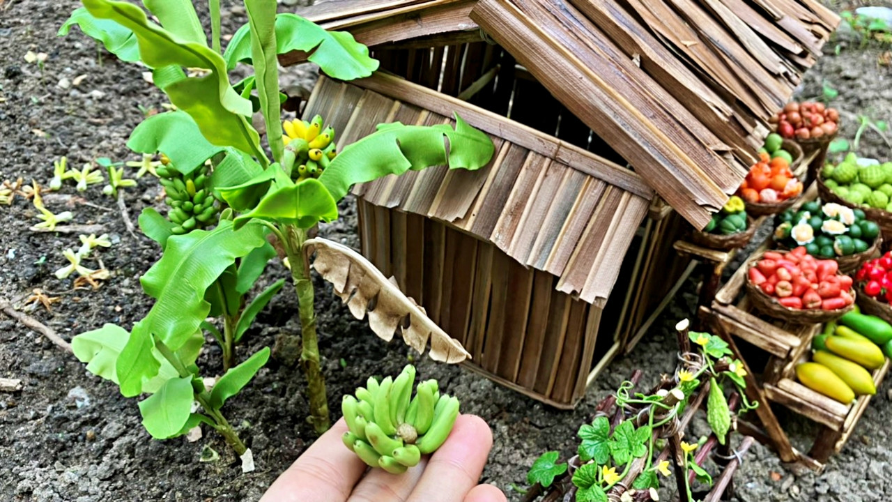 Các loại trái cây này được bài trí, xếp đặt trên những kệ nằm phía trước, bên cạnh ngôi nhà lá siêu mini. Cách ngôi nhà không xa là bụi chuối, giàn khổ qua, vườn bạc hà, gốc cà chua… Khung cảnh đậm nét miệt vườn miền Tây.