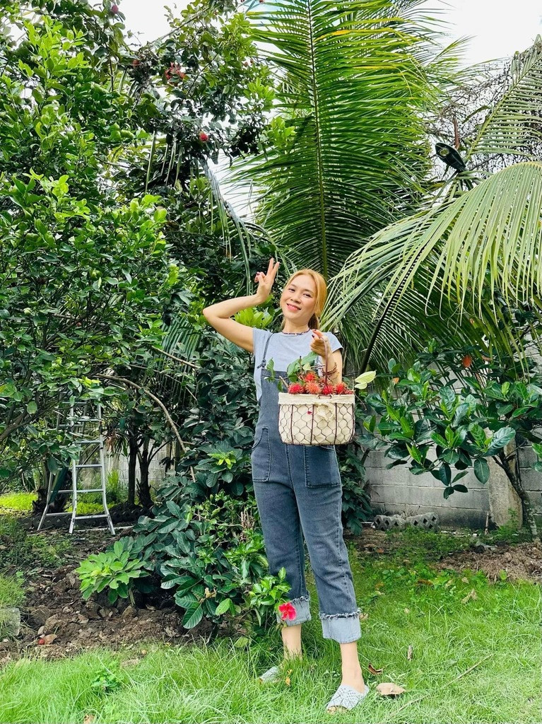 Mỹ Tâm khoe cảnh thu hoạch chôm chôm trong vườn nhà. Cô đứng giữa khu vườn xanh mướt, vui vẻ tạo dáng chụp hình, trên tay xách 2 giỏ chôm chôm chín đỏ.