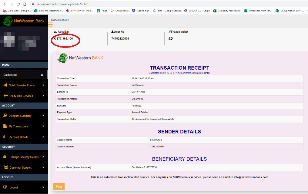 Chị H.H. từng làm ở ngân hàng nên khá hiểu về Swift code cũng như cách phân biệt ngân hàng giả mạo. Chị đã vào Google kiểm tra xem có ngân hàng nào trên thế giới tên là NATWESTERNBANK (tên ngân hàng mà đối tượng cung cấp). Sau khi phát hiện không có ngân hàng nào như vậy, chị H.H. biết đã gặp “siêu lừa” nhưng vẫn tiếp tục “diễn” để hiểu thêm chiêu trò của đối tượng.