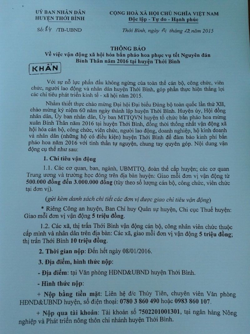| Văn bản Thông báo "Khẩn" của Chủ tịch UBND huyện Thới Bình Trần Văn Dũng đặt chỉ tiêu về mức tiền cần vận động xã hội hóa bắn pháo hoa |