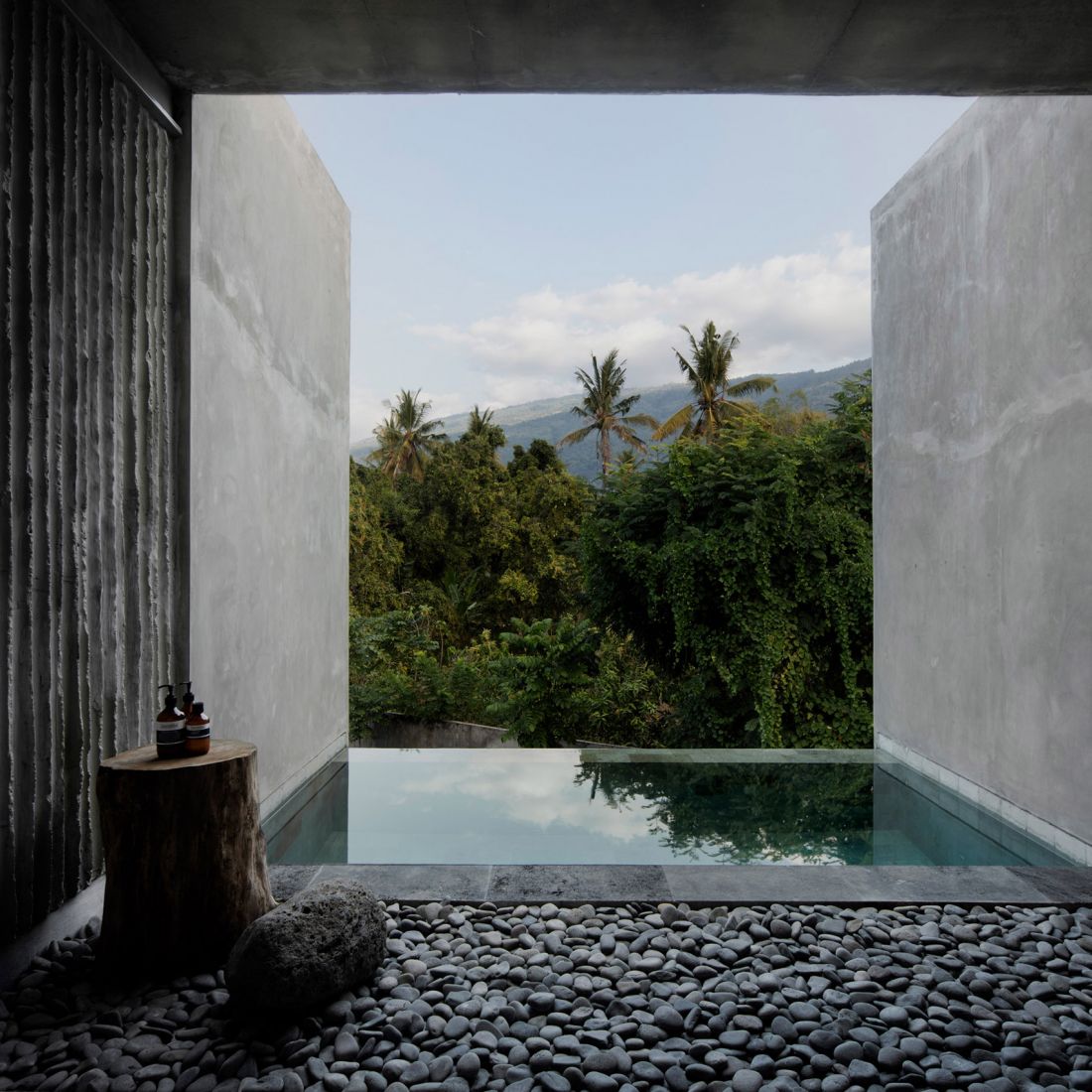 Được bao quanh bởi những bức tường bê tông chắc chắn, đúc trên nền tre có nguồn gốc địa phương là đặc điểm nổi bật khắp The Tiing - một khách sạn boutique trên bờ biển phía bắc của Bali.