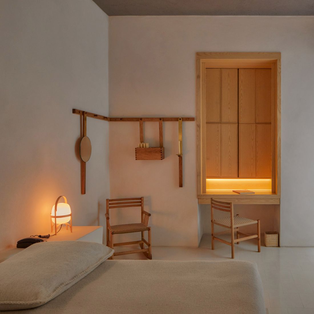 Bên trong mỗi dãy phòng khách sơn trắng chỉ có một vài thanh gỗ cao cấp hỗ trợ giường và tủ đựng đồ. Trang trí chỉ giới hạn ở các thanh vịn gắn trên tường, từ đó các hộp đồ trang sức, gương và ghế gỗ khung sáng được treo lên.