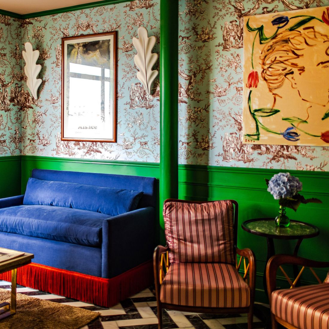40 phòng ngủ ở khách sạn Les Deux Gares, Pháp nằm tầng trên có thảm hình học và đầu giường sọc, trong khi sảnh đợi ở tầng dưới có giấy dán tường sang trọng, ghế sofa họa tiết da báo và các bức chân dung vẽ tay. Tất cả tạo nên một không gian sống động, vui tươi và pha một chút cổ điển đầy thú vị.