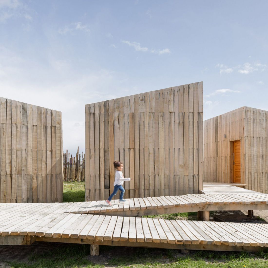 Một cụm sáu cabin bằng gỗ lenga tạo thành khách sạn độc đáo Patagonia, Chile. Mặt trước của các cabin không có cửa sổ nhưng độ cao phía sau được lắp đặt bằng các tấm kính mở rộng để du khách có thể thưởng ngoạn quang cảnh con kênh gần đó và những cánh đồng rải rác những đàn cừu đang gặm cỏ.
