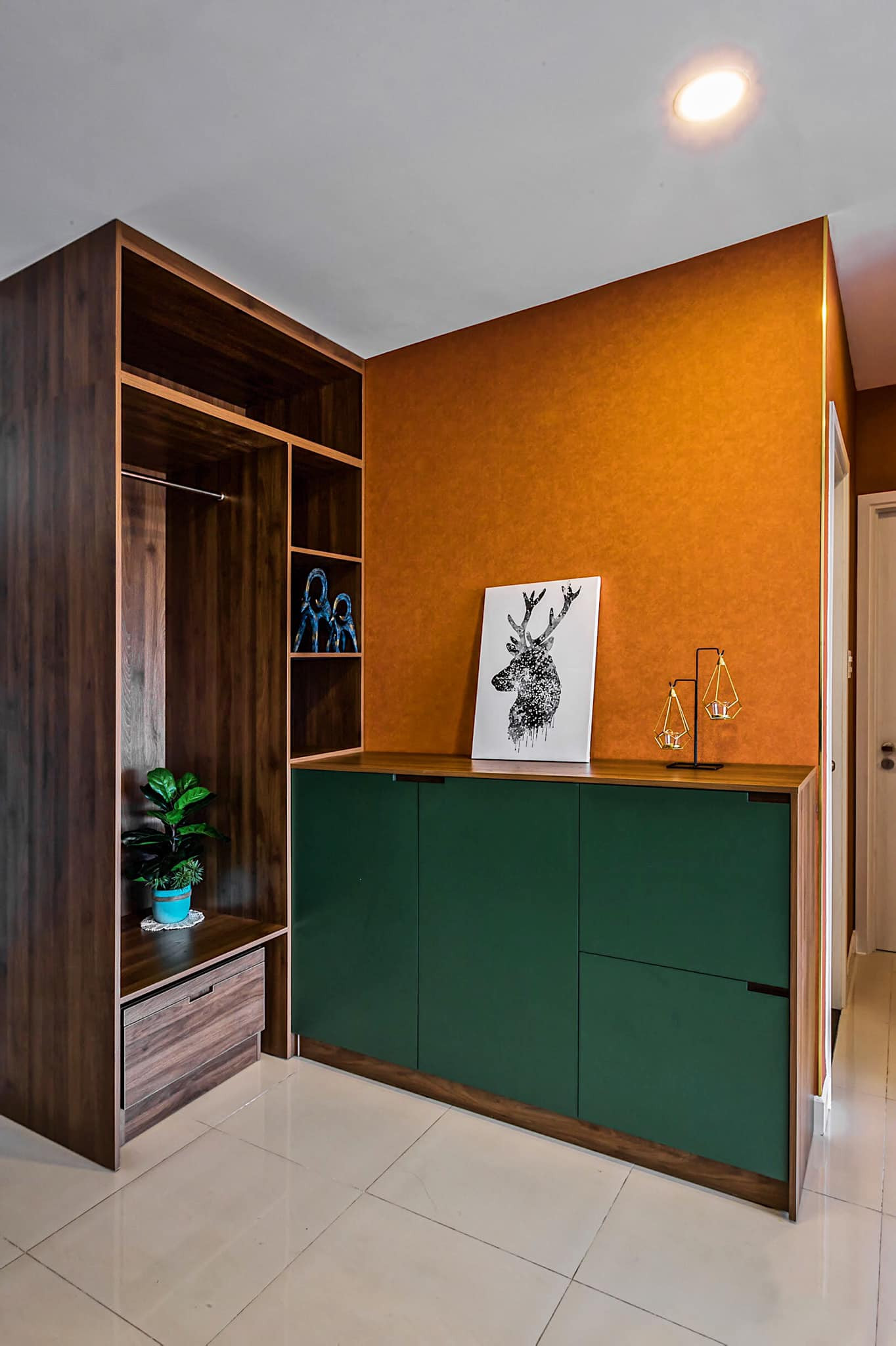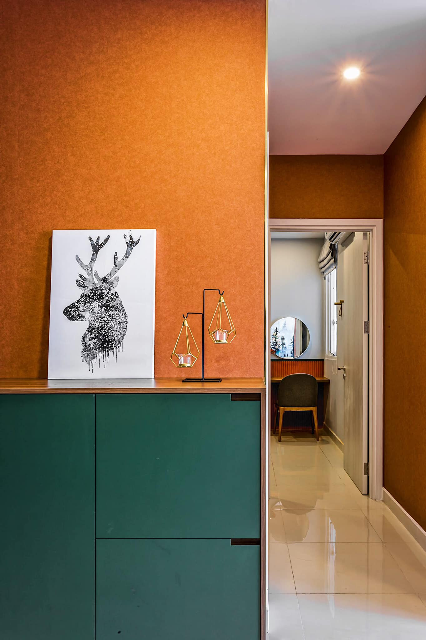 Mảng màu cam ấm áp hài hòa với tone xanh lá cây đậm, cho phòng ngủ thật dễ chịu, yên bình.