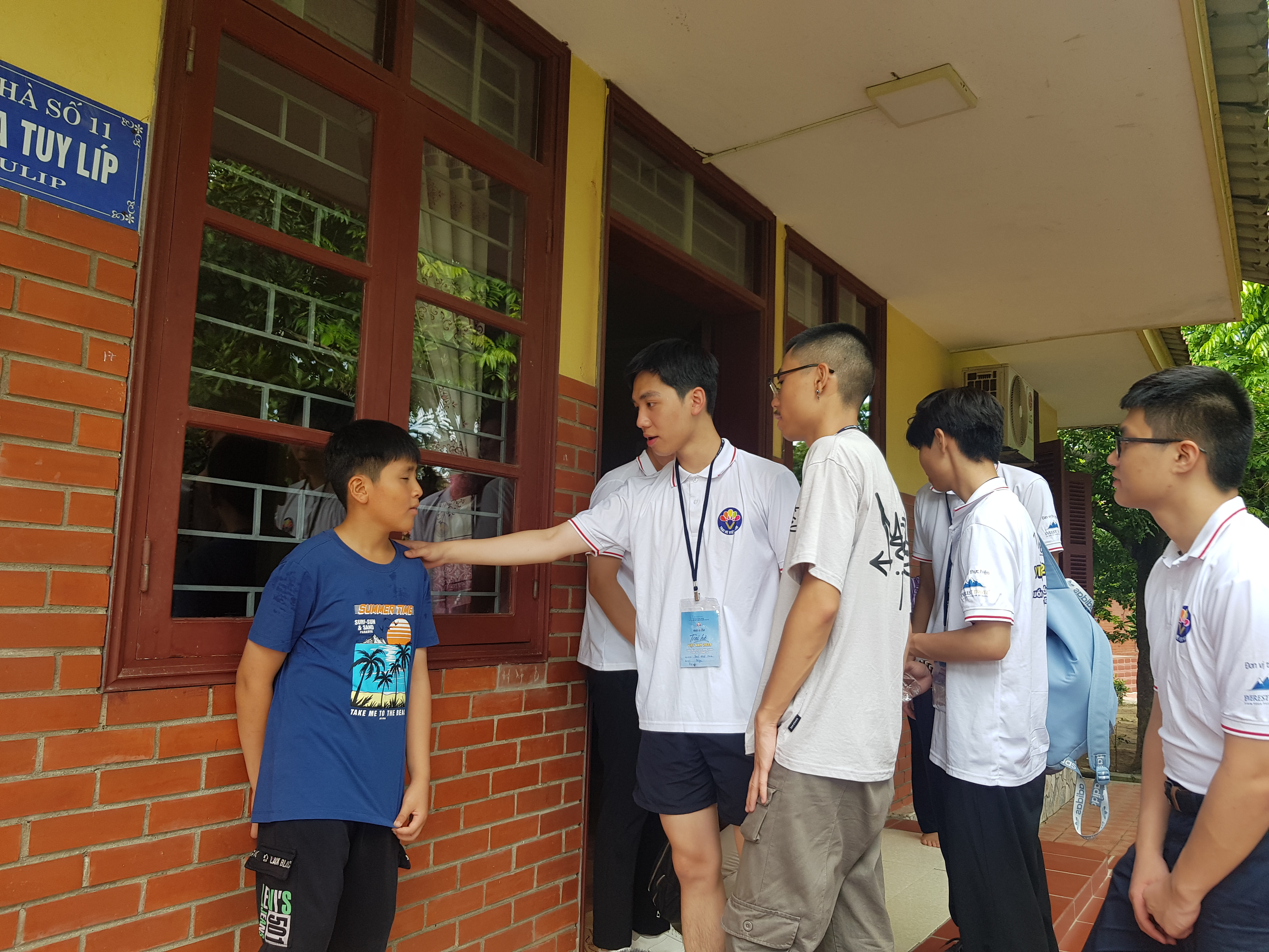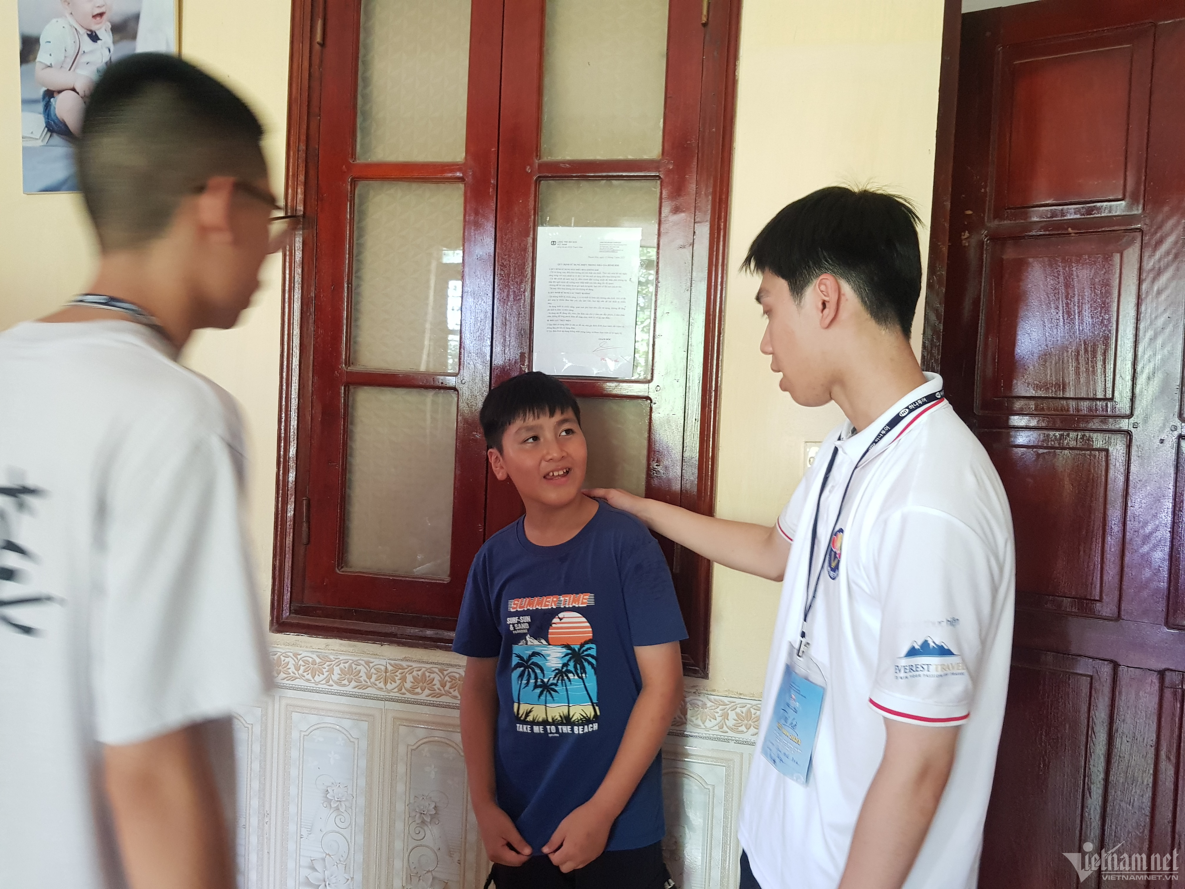 Bạn Đức Anh quan tâm, động viên em nhỏ luôn tự tin và mỉm cười.