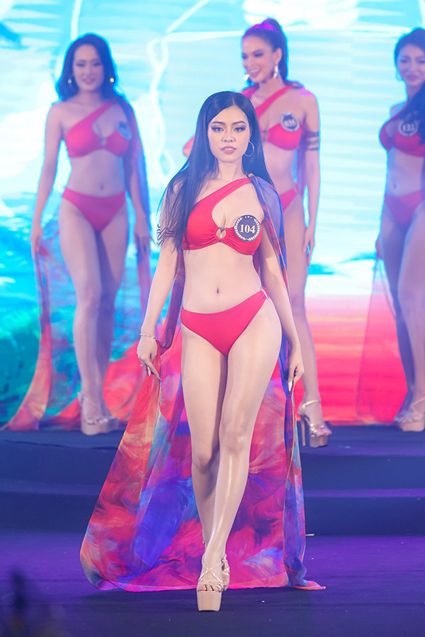 Đêm chung kết “nóng” hơn với phần trình diễn bikini. Bikini có tông màu đỏ rực, tôn lên vóc dáng săn chắc và quyến rũ, áo choàng rực rỡ sắc màu đã giúp cho phần trình diễn của các thí sinh thêm bay bổng và thăng hoa. Bên cạnh đó, các cô gái cũng sải bước tự tin trên sân khấu, phô diễn khả năng catwalk sau khoảng thời gian dài tập luyện.