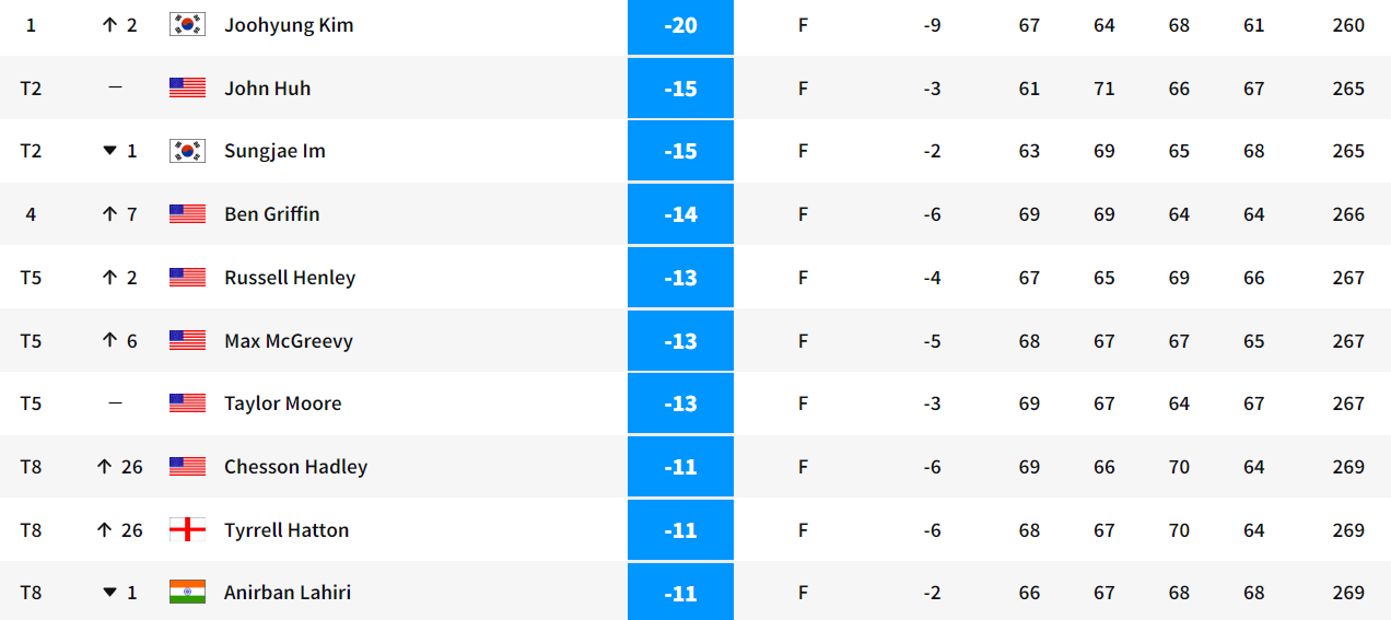 Kim Joo Hyung trở thành người thứ năm đạt số gậy thấp đến thế trong ngày chung kết một sự kiện PGA Tour tính từ 1983, thời điểm lần đầu tiên thống kê từ hố). Người gần nhất đánh 61 gậy trong ngày Chủ nhật là Rory McIlroy ở RBC Canadian Open 2019.