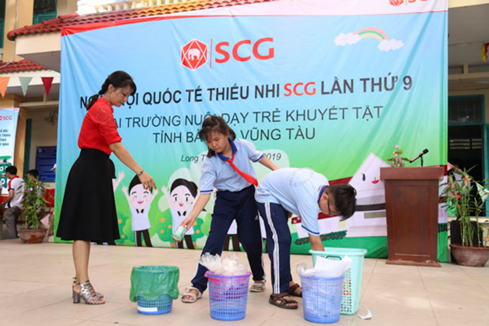 Tập đoàn SCG cũng trao tặng thùng rác, truyền cảm hứng về giá trị của những đồ vật tái chế, và cách phân loại rác cho trường khuyết tật Bà Rịa - Vũng Tàu, nhằm tạo điều kiện cho các em hình thành ý thức bảo vệ môi trường từ hành động nhỏ nhất. Cùng với đó, các đại diện trẻ của Việt Nam đã tham gia trải nghiệm những dự án phát triển bền vững, dựa trên cách tiếp cận về Nền kinh tế tuần hoàn cùng với bạn bè khu vực thông qua Hội trại SCG Sharing The Dream ASEAN 2019