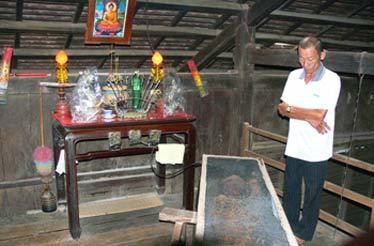 | Ông Trí bên quan tài đựng xác khô của ông Hạo (Ảnh: AnGiang Online) |
