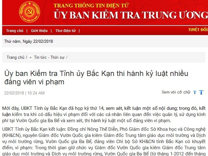 UBKT Tỉnh ủy Bắc Kạn quyết định kỷ luật bằng hình thức khiển trách đối với Phó Giám đốc Sở Khoa học và Công nghệ Nông Thế Diễn và Thượng tá Trần Minh Tâm, Phó Trưởng phòng Cảnh sát môi trường, Công an tỉnh Bắc Kạn.