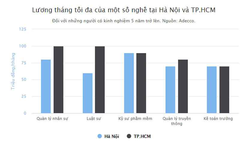 Đối với những người có kinh nghiệm 5 năm trở lên. Nguồn: Adecco.Hà NộiTP.HCMQuản lý nhân sựLuật sưKỹ sư phầm mềmQuản lý truyềnthôngKế toán trưởng0255075100125