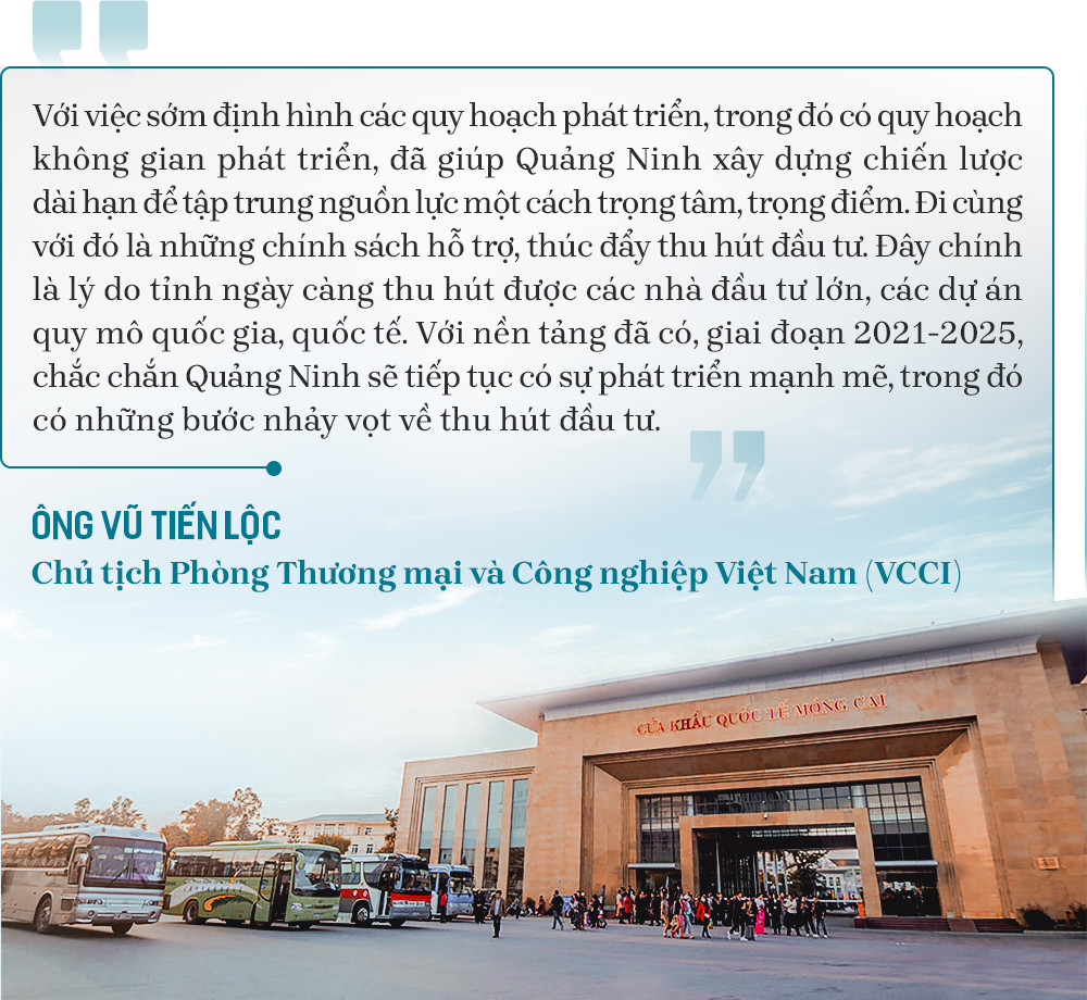 Sau quá trình nghiên cứu kỹ lưỡng, năm 2014 Quảng Ninh công bố 7 quy hoạch chiến lược của tỉnh đến năm 2020, tầm nhìn đến năm 2030. Từ đây, tỉnh đã xác định rõ không gian phát triển theo hướng: Một tâm, hai tuyến đa chiều và 2 mũi đột phá là KKT Vân Đồn và KKT Cửa khẩu Móng Cái. Tâm TP.Hạ Long là trung tâm chính trị - hành chính - kinh tế - văn hóa của tỉnh. Tuyến hành lang Đông - Tây được ví là “đôi cánh” để Quảng Ninh hiện thực hoá mục tiêu phát triển nhanh, mạnh, bền vững, trở thành cực tăng trưởng ở phía Bắc của Việt Nam.