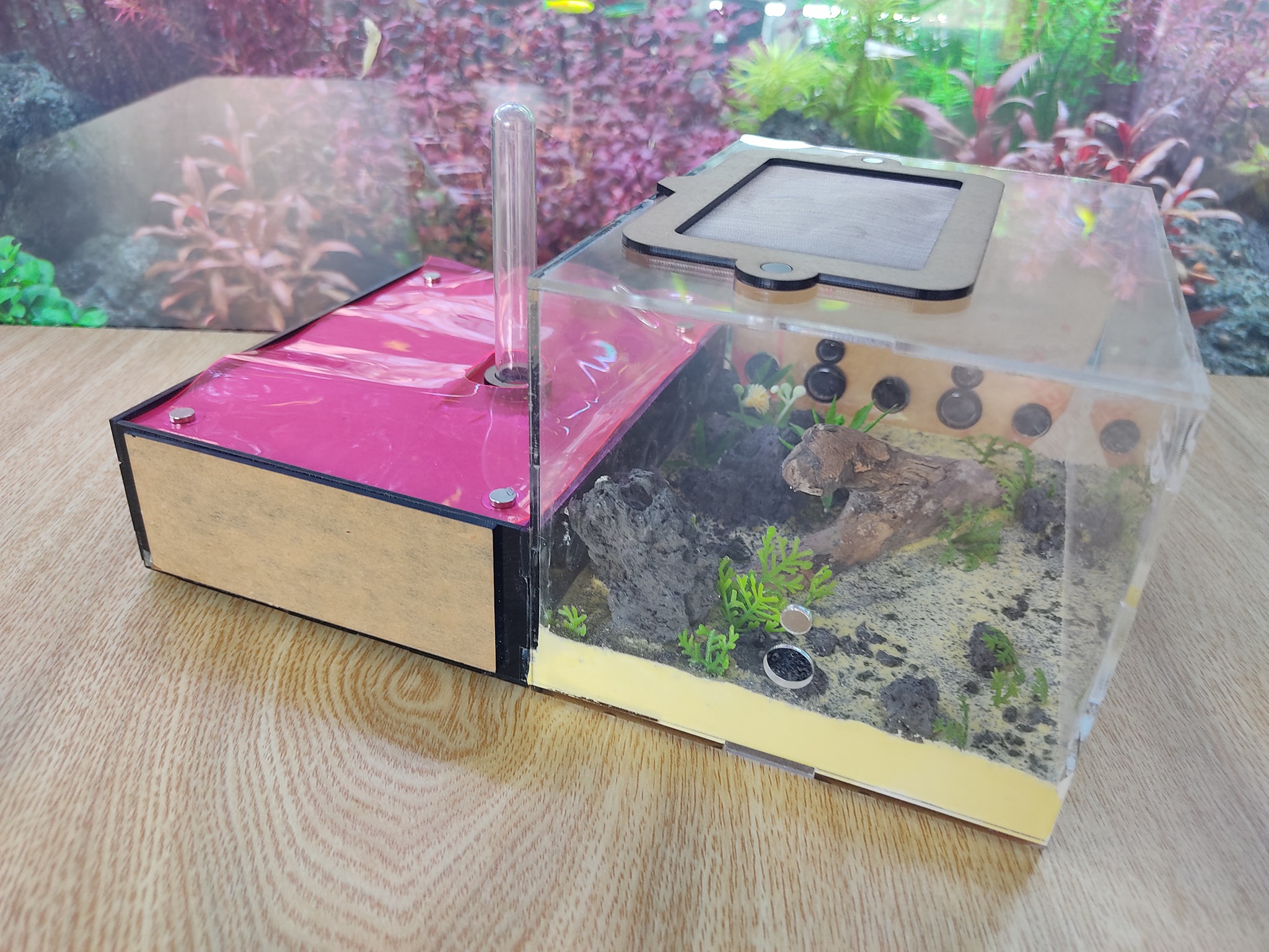 Phần nắp được làm bằng lưới để tạo độ thông thoáng. Minh Nhựt tự thiết kế không gian săn mồi cho kiến bằng cỏ cây nhựa, đá thậm chí là cành cây,... (Ảnh: Nhựt Nguyễn).