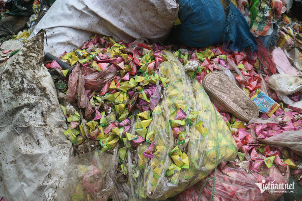 Số rác còn lại được vun gọn thành một đống cạnh điểm trung chuyển rác sinh hoạt của xã La Phù (huyện Hoài Đức, TP Hà Nội). Lẫn trong số này vẫn còn những bao tải đã bị rách, chứa bim bim, kẹo, thạch… nhái các thương hiệu lớn trên thị trường.