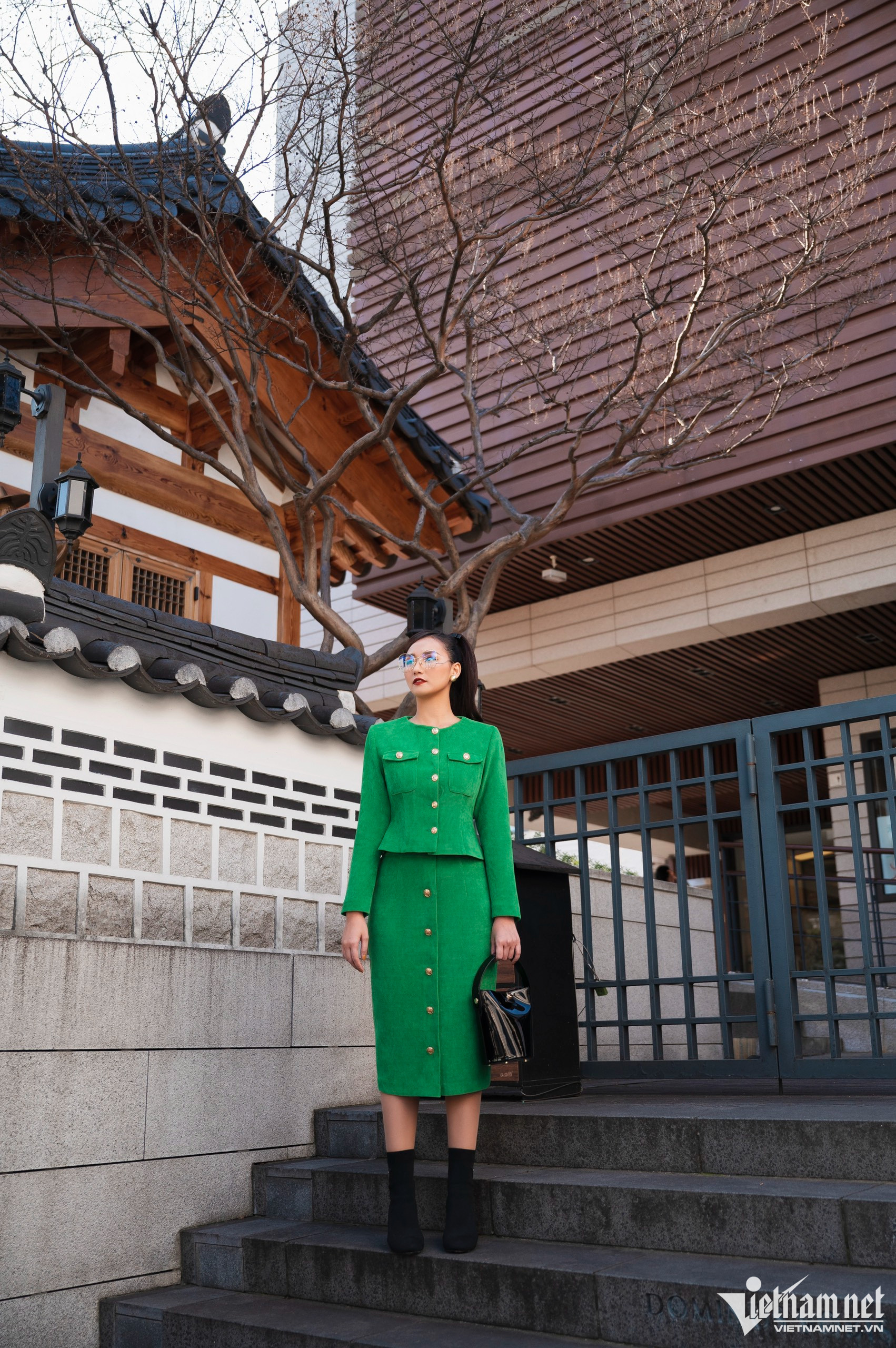 Nữ diễn viên chọn những trang phục có tông màu nổi bật như cam, đỏ để thực hiện bộ ảnh. Cô kết hợp phụ kiện hàng hiệu của Dior, D&G để tăng độ sang chảnh cho set đồ dưới nắng thu tuyệt đẹp ở Seoul.
