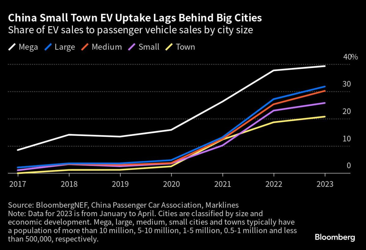 Theo thống kê của Bloomberg, doanh số bán xe điện của Trung Quốc đạt 5,67 triệu xe, đứng thứ nhất trên toàn thế giới. Tuy nhiên, doanh số bán hàng khổng lồ này lại chỉ tập trung chủ yếu ở các thành phố lớn. Mức độ phổ biến xe điện tại các thành phố lớn của Trung Quốc là 40% trong khi con số này ở các vùng quê khá khiêm tốn, chỉ 21%.