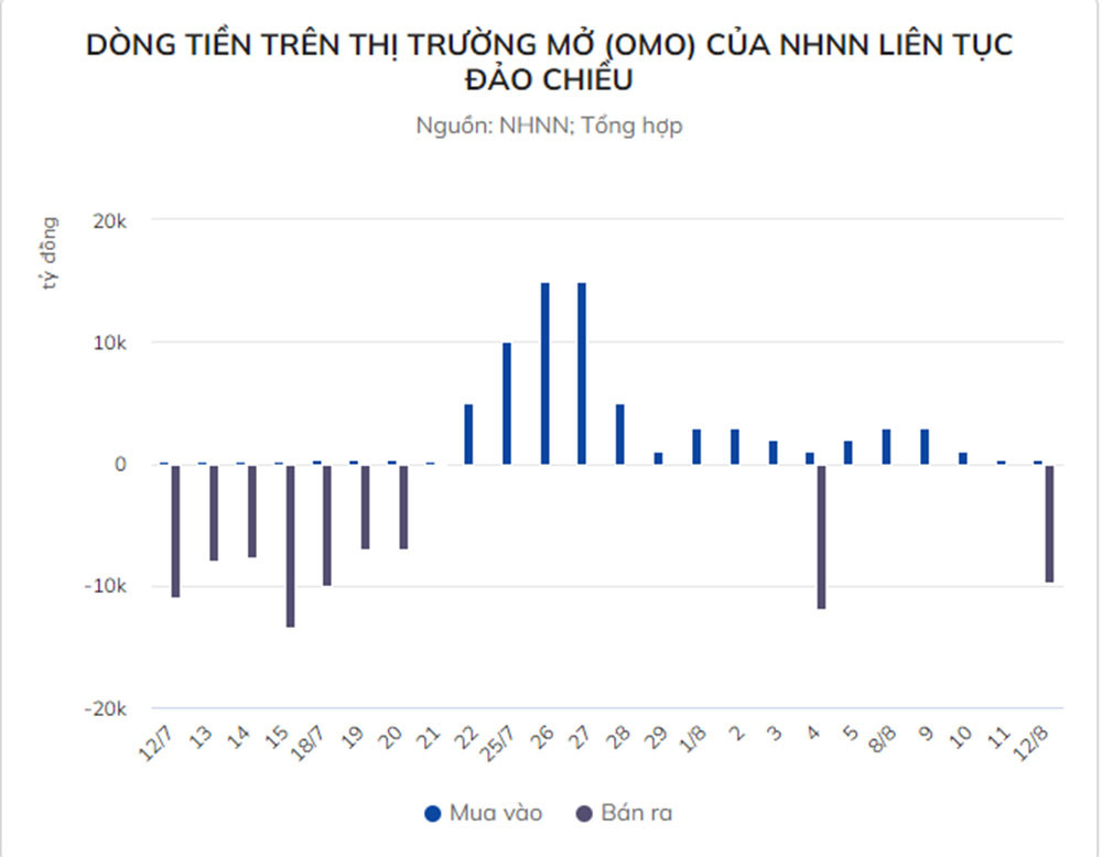 Trước biến động đột ngột này, NHNN cũng lập tức can thiệp vào thị trường với việc giảm lượng tín phiếu mua về từ ngày 10/8 và chính thức đảo chiều dòng tiền trên kênh này trong phiên 12/8 với việc bán ra 9.700 tỷ đồng tín phiếu kỳ hạn 7 ngày, lãi suất 2,6%/năm, qua đó rút về lượng tiền Đồng tương ứng.