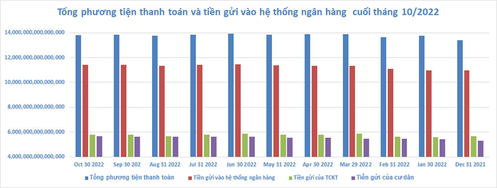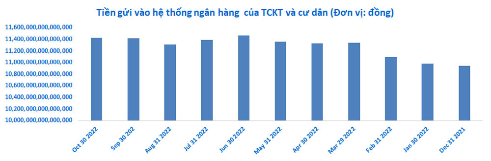 Tổng tiền gửi vào hệ thống ngân hàng tính tới cuối tháng 10 vẫn còn thấp hơn so với mức đỉnh đạt được hồi cuối tháng 6 (khi đó đạt gần 11,47 triệu tỷ đồng).