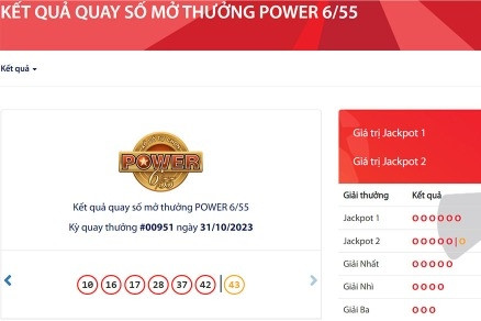 Lần gần nhất mà sản phẩm Power 6/55 xuất hiện người trúng Jackpot 1 là vào kỳ quay số mở thưởng lần thứ 951 diễn ra vào tối 31/10. Tại kỳ quay này, Hội đồng mở thưởng của Vietlott xác định 1 vé số trúng giải Jackpot 1 trị giá hơn 173 tỷ đồng.