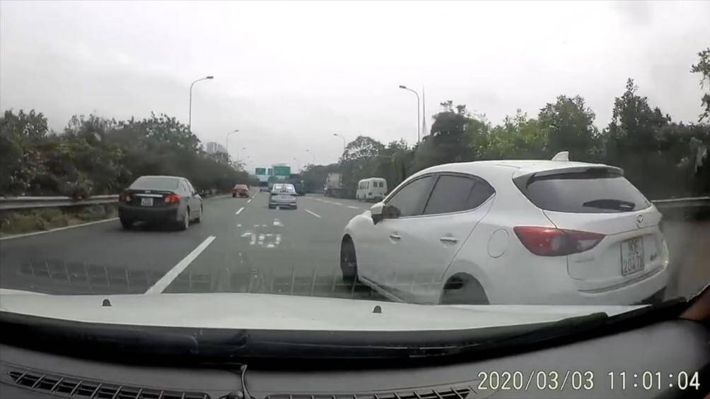Dù đang đi ở làn tốc độ thấp trên đại lộ Thăng Long và phía trước vướng 2 ô tô nhưng tài xế xe tải nặng vẫn cố tình vượt lên và tạt đầu chiếc xe con để chuyển làn.