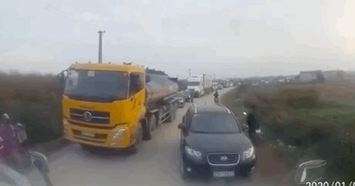 Người đàn ông điều khiển xe máy đã cố vượt lên trước chiếc xe tải, dẫn tới va chạm và suýt bị xe tải cán qua đầu. Sự việc xảy ra sáng nay tại Nghệ An.