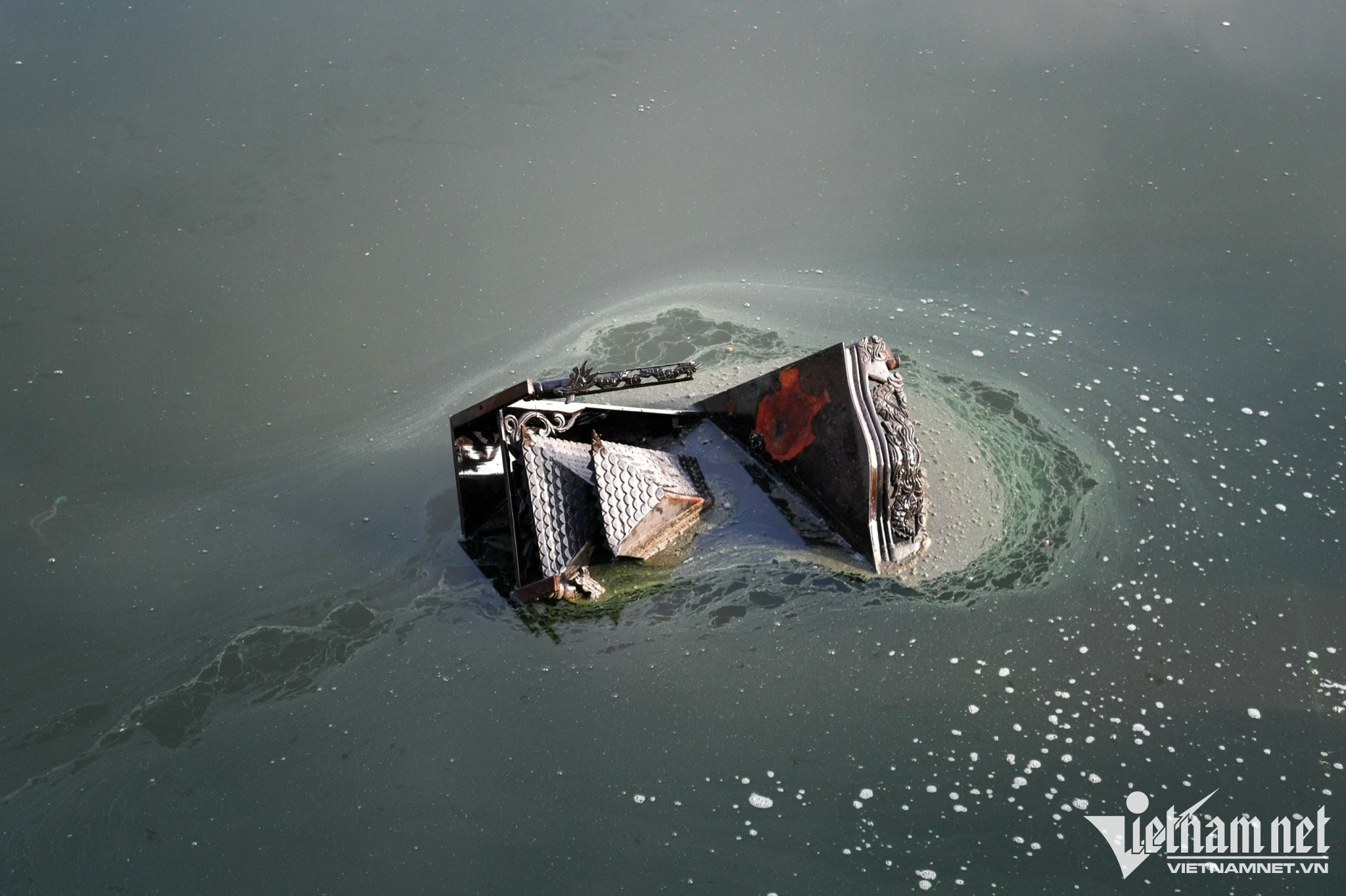 Cá chép đỏ chết nổi lềnh bềnh, nhiều người vẫn xả tro, chân hương từ trên cầu xuống sông. Ảnh: Hùng Nguyễn Việt.
