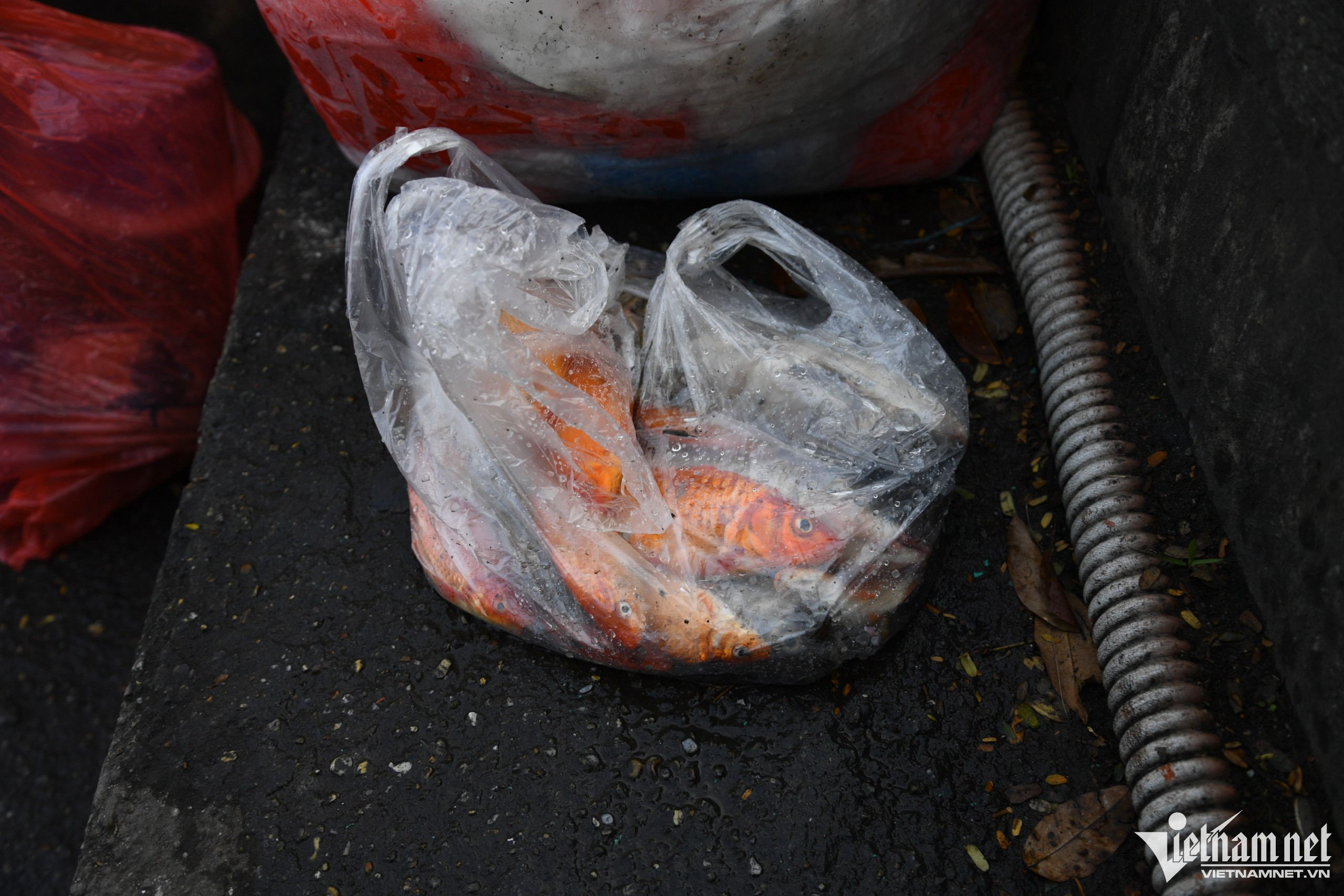 Có gia đình cúng hàng trăm con cá rồi cho vào trong một chiếc thùng nhựa mang đi phóng sinh. Ảnh: Nhật Sinh.