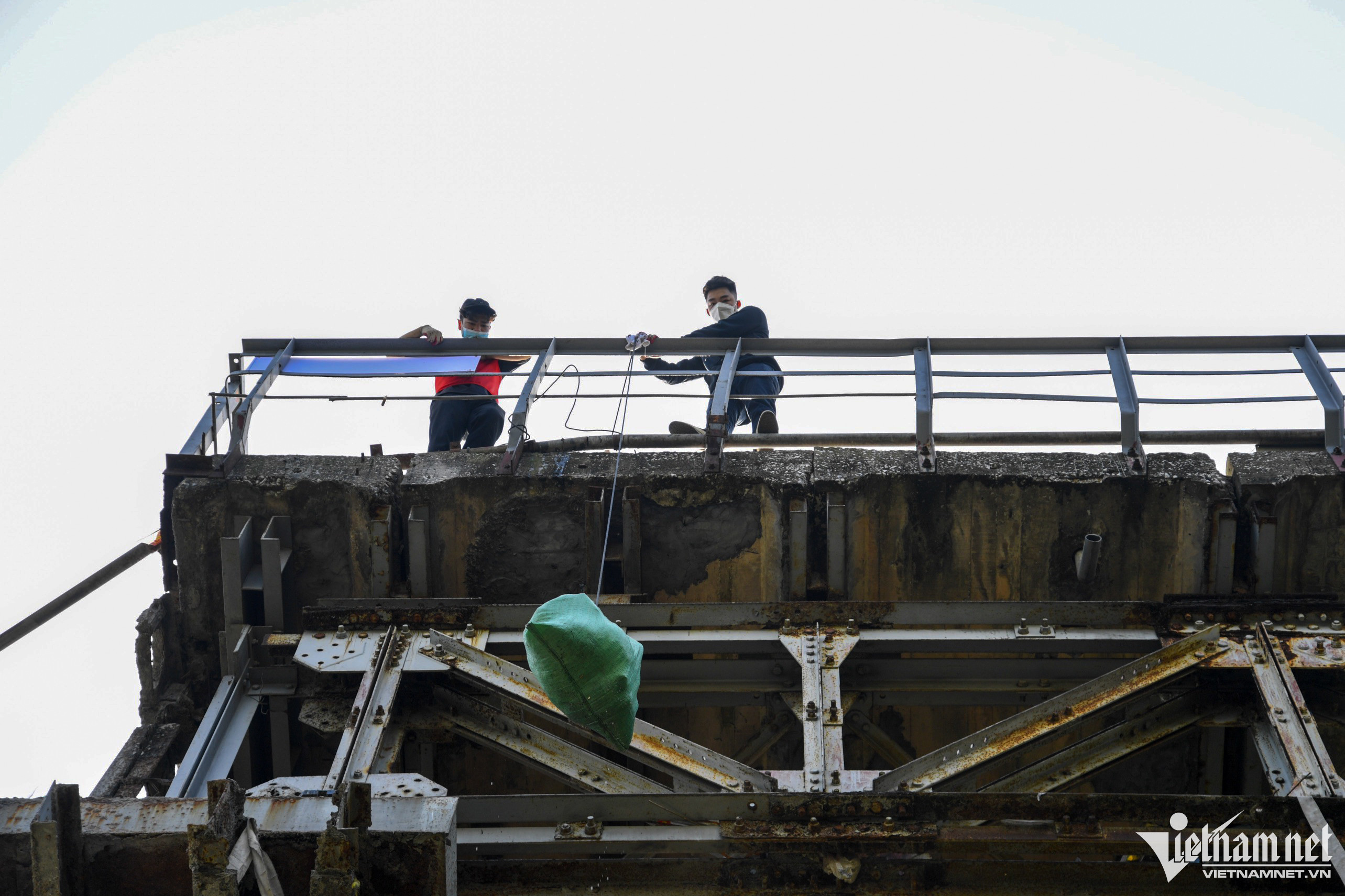 Phía trên cầu các bao tải tro được đội tình nguyện thả xuống dưới để xử lý. “Từ sáng đến giờ đội chúng tôi đã gom hơn 50 bao”, Nguyên (đội tình nguyện) nói.