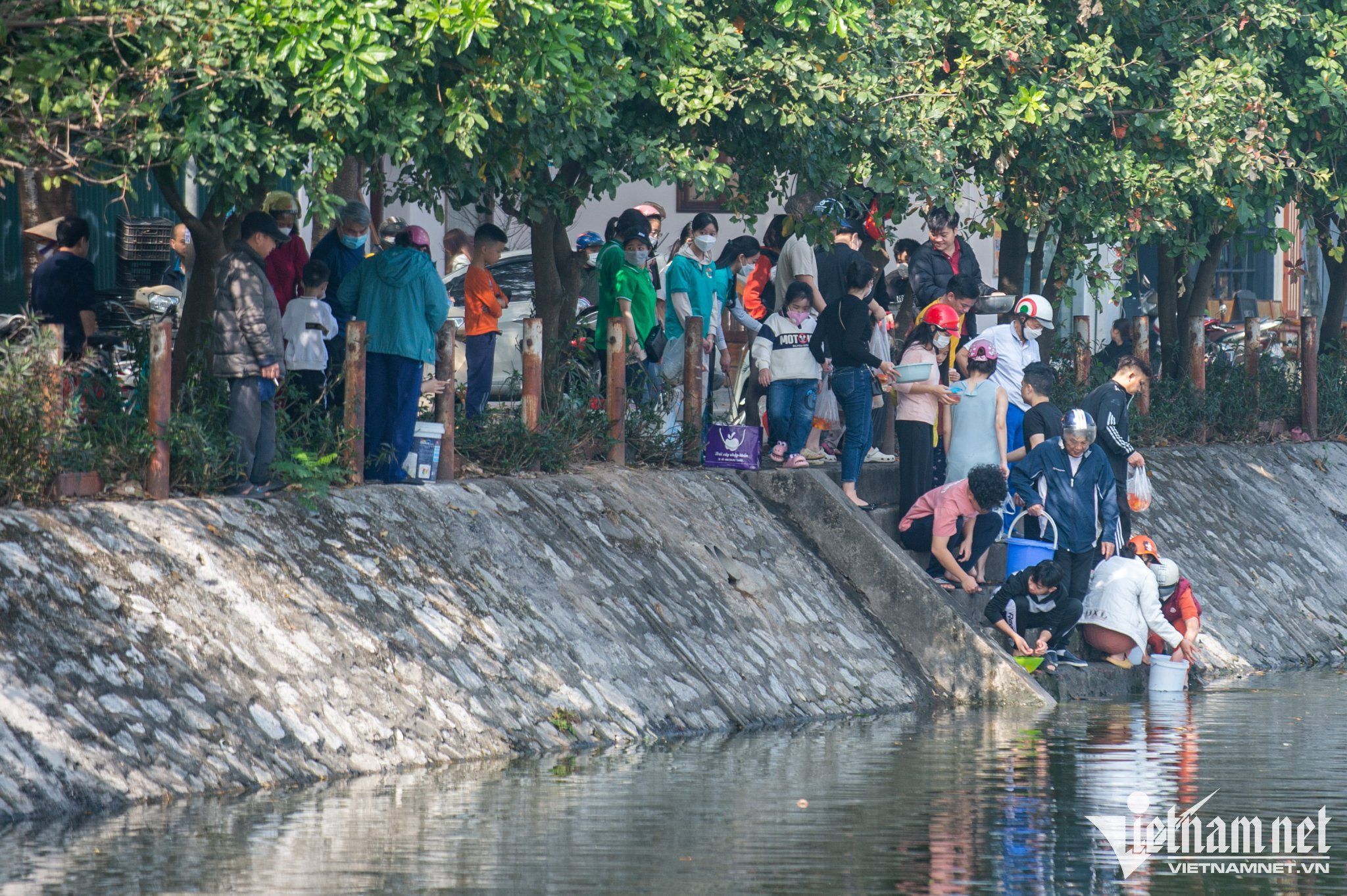 11h trưa, người dân xếp hàng thả cá tại khu vực hồ Văn Quán (quận Hà Đông). Ảnh: Nhật Sinh.