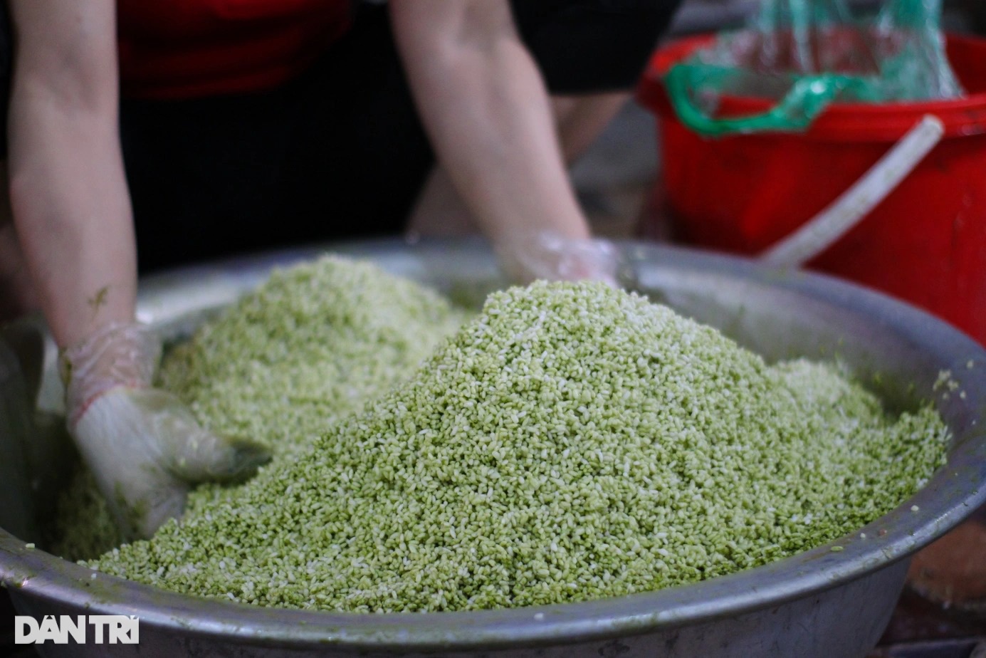 Gạo gói bánh cũng phải là loại ngon nhất, gạo nếp cái hoa vàng. Để bánh có màu xanh đẹp mắt và thơm, chị Thùy trộn gạo với nước lá giềng. |