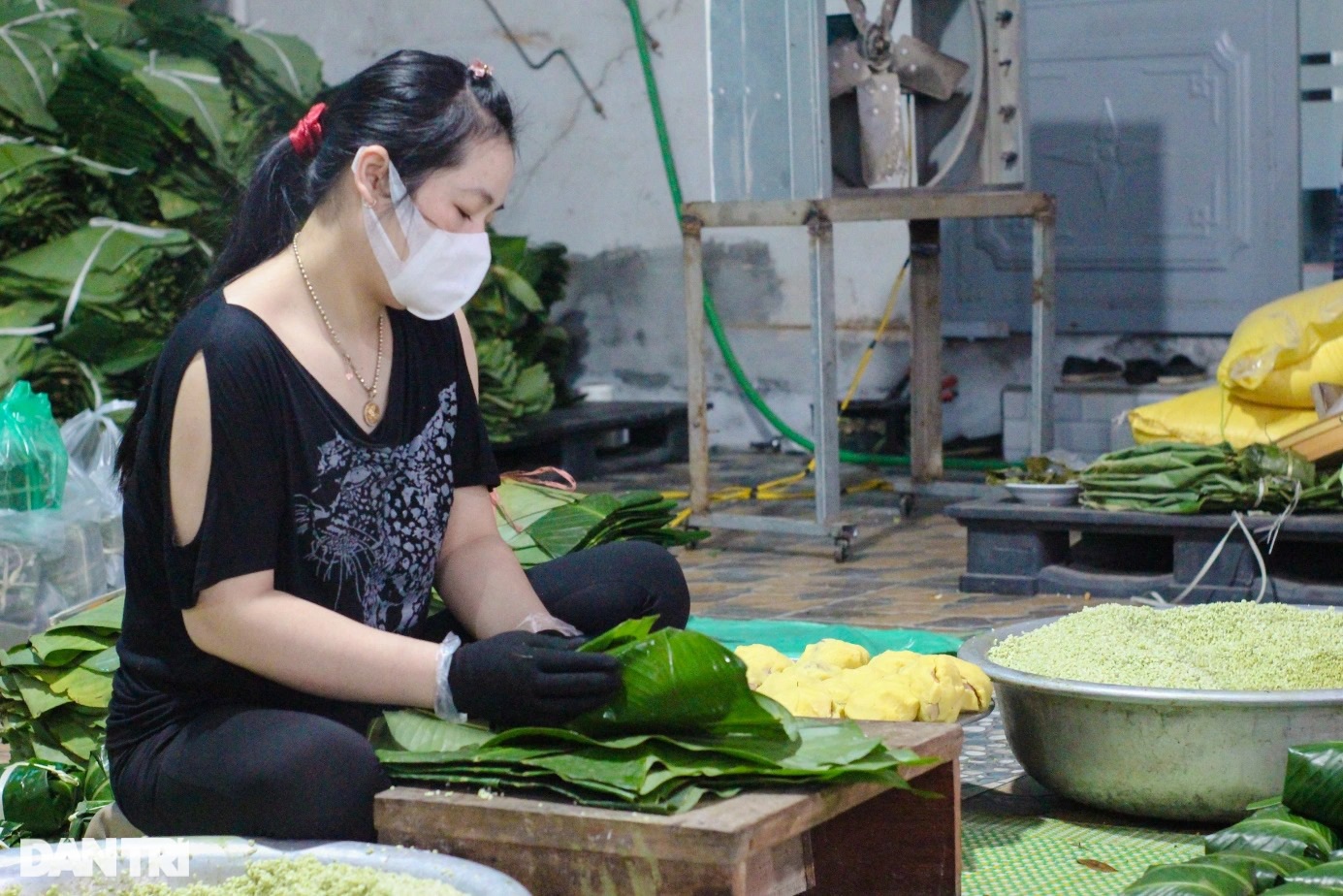 Mỗi ngày, hơn 10 người thợ cho ra lò gói trên dưới 7000 chiếc bánh. Càng dịp cận Tết, khối lượng bánh gói càng lớn, làm quên ăn quên ngủ mới đủ giao cho khách. |
