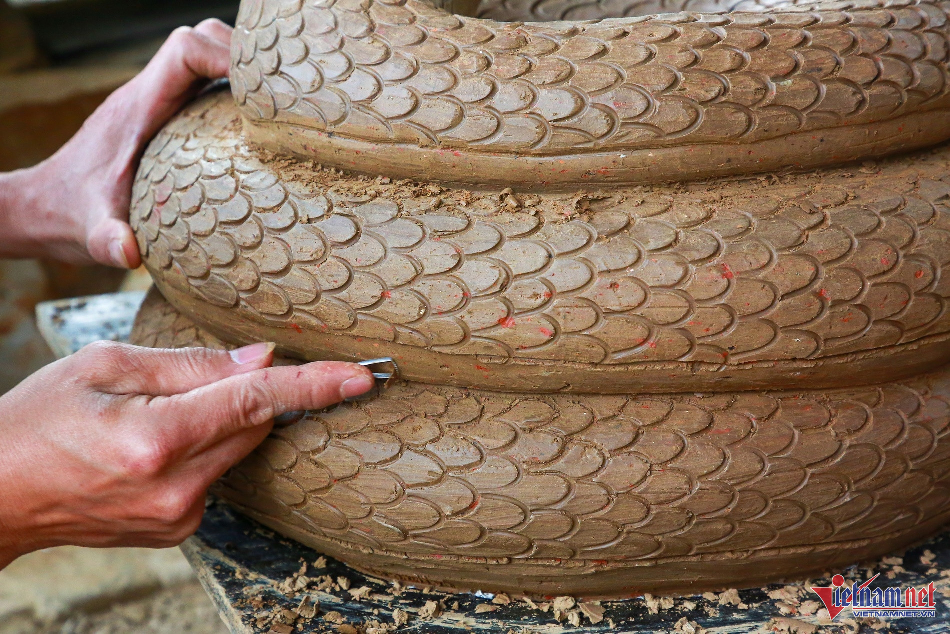 Ngoài ra, khâu khắc vảy rắn cũng đòi hỏi phải có sự tỉ mỉ. Anh mất 4 ngày mới đánh xong vảy cặp rắn bằng gốm này. Tổng thời gian hoàn thành 2 tượng là hơn 20 ngày.