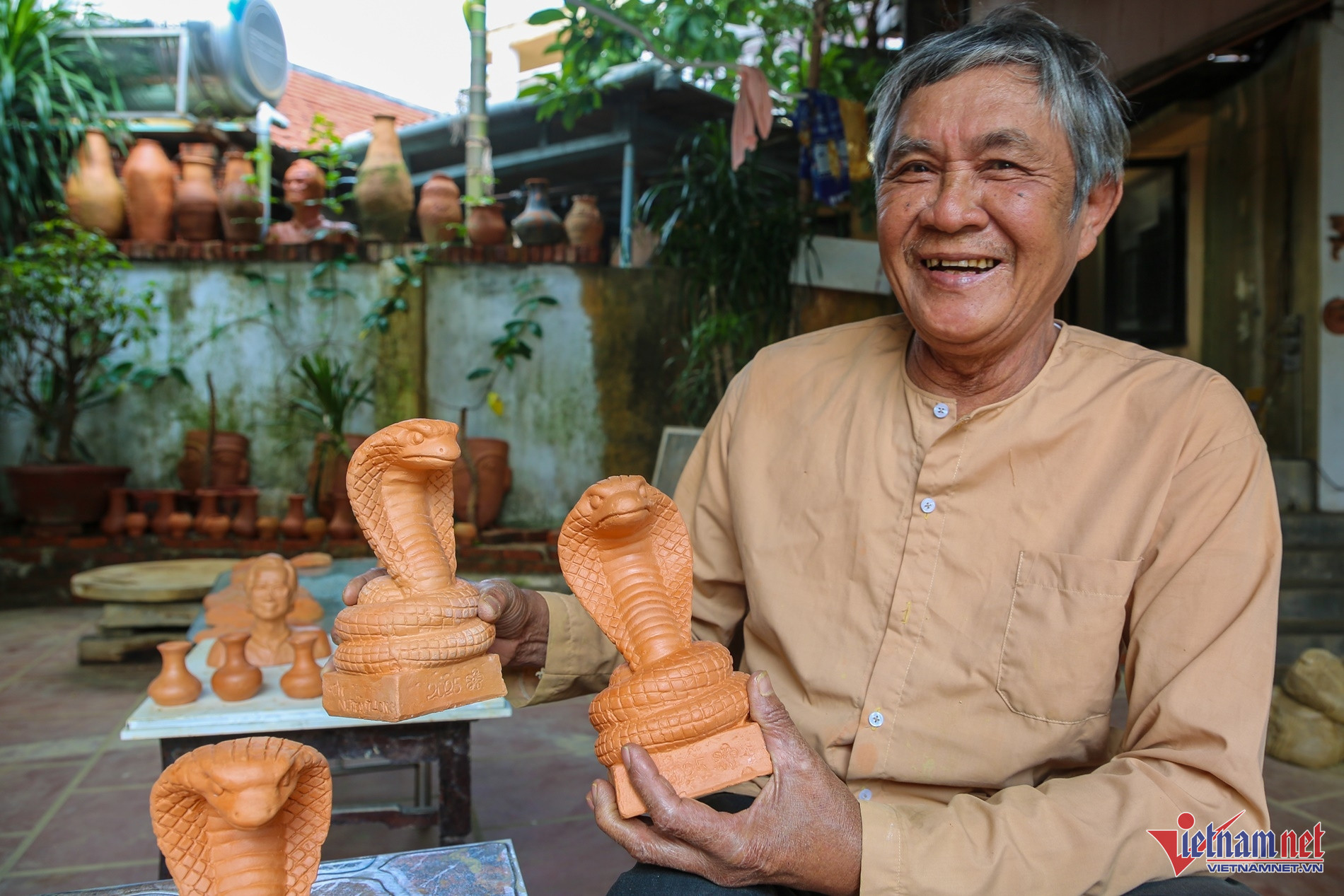 "Tôi vừa chế tác xong 100 tượng rắn bằng gốm để bán cho du khách, giá 150.000 đồng một con", ông Long khoe.