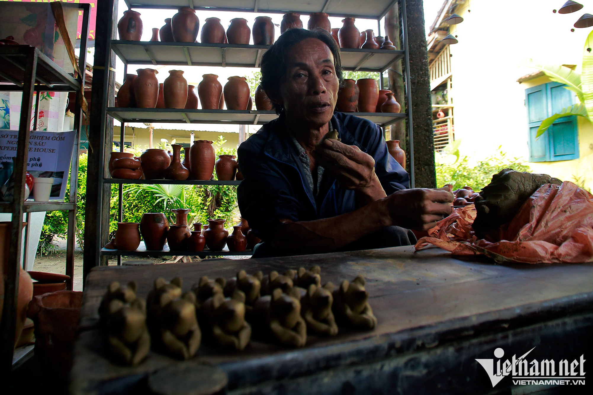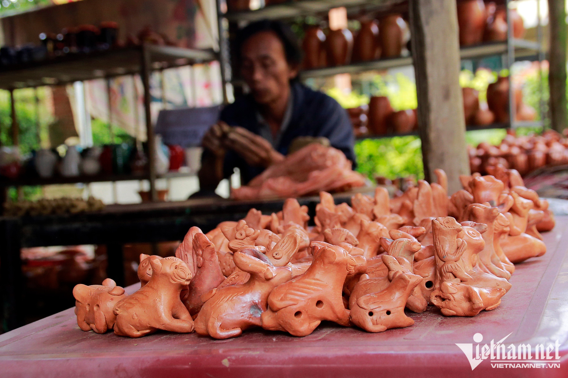 Ông kể, năm nay con gái từ TP Đà Nẵng về giúp, gia đình ông tập trung vào sản phẩm tò he cùng những tác phẩm bằng gốm khác như: lọ hoa, heo đất...
