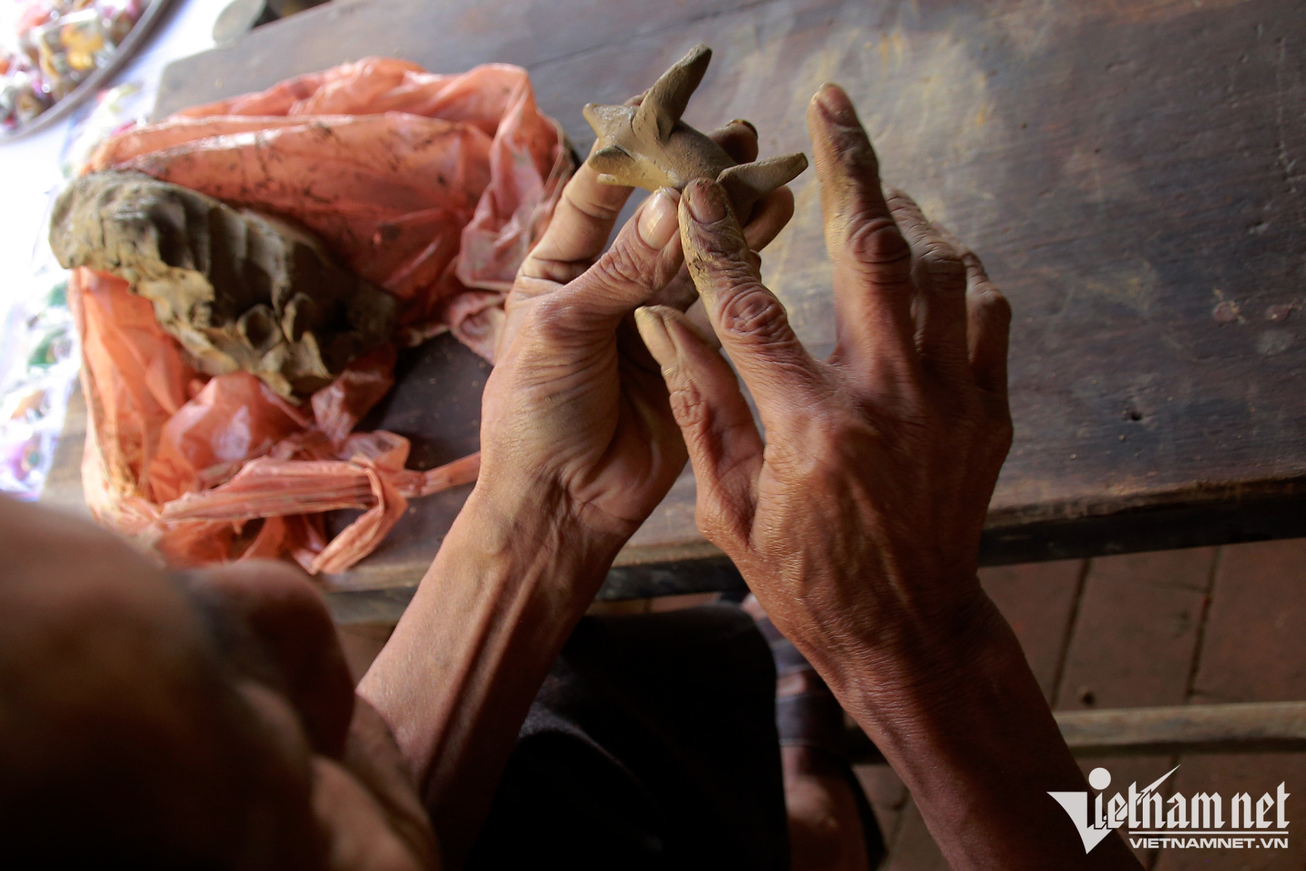 Tìm đến ngôi nhà ông Nguyễn Sáu (59 tuổi, phường Thanh Hà), đôi tay ông thoăn thoắt không ngừng nặn những chú tò he bằng đất sét.