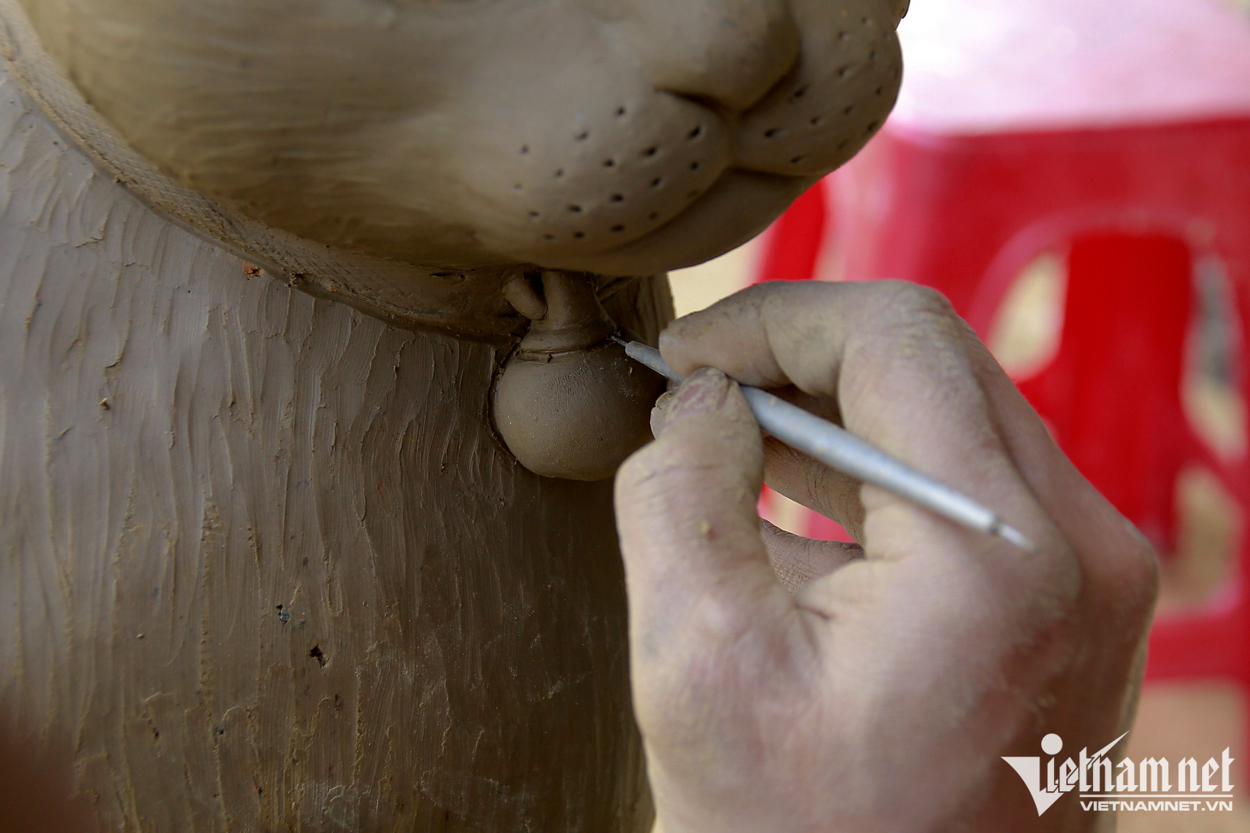Gần gia đình ông Sáu, anh Lê Văn Nhật (34 tuổi, phường Thanh Hà) đang chăm chút hoàn thiện một con mèo khá lớn trên nền đất sét.