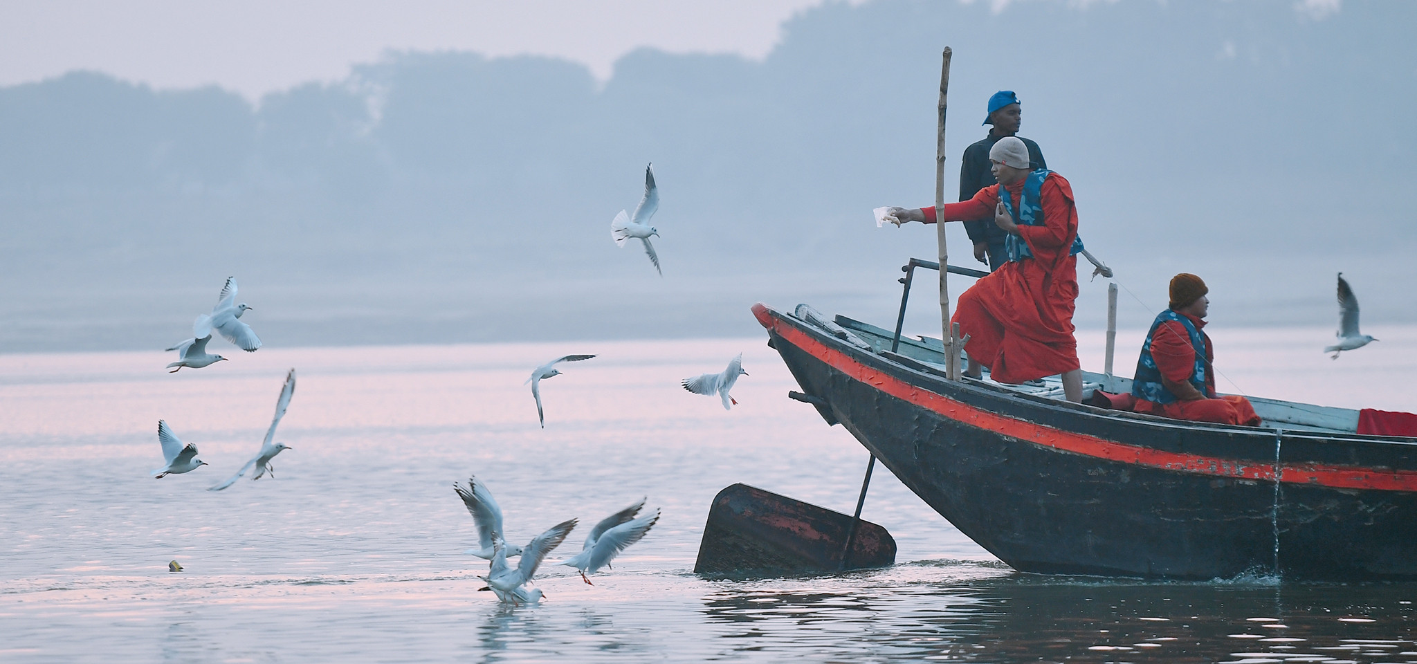 Tới bờ sông Hằng ngắm bình minh và hoàng hôn cùng làn sương mờ ảo là điều không nên bỏ lỡ. Với những khách đi thuyền mang theo bánh mì có thể xé ra để lên lòng bàn tay hoặc ném xuống nước. Ngửi thấy mùi, hàng chục con chim sẽ bay tới rồi sà xuống tranh nhau mổ thức ăn tạo nên cảnh sắc cực kỳ lý thú.