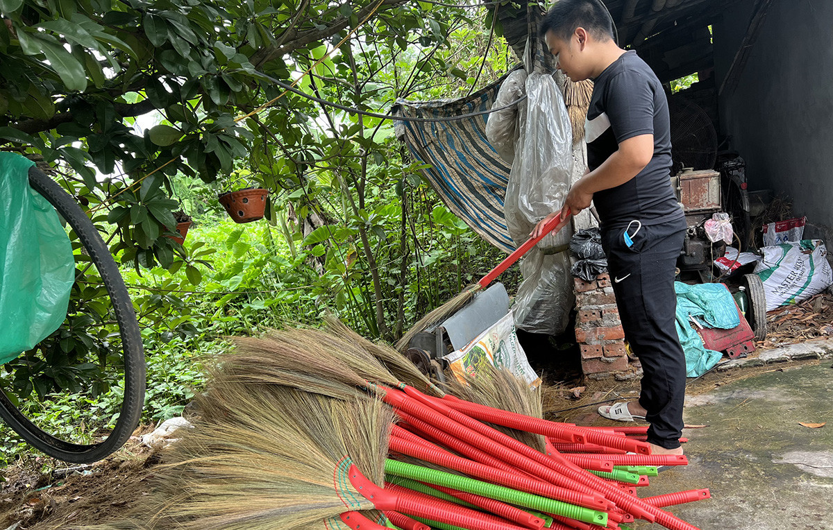 Mỗi ngày, tại nhà anh có khoảng 4-5 nhân công đến làm chổi, sản xuất được 150-200 chiếc.
