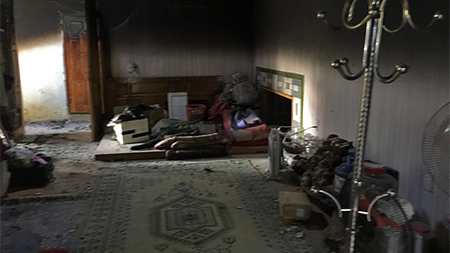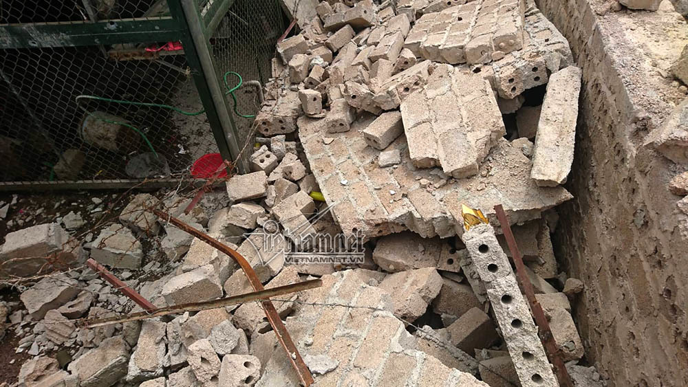 | Căn nhà của đối tượng Nguyễn Thanh Tuân chi chít vết đạn, tường bao bị xô đổ |
