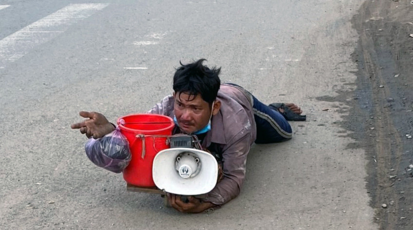 Chiều 27/7, Thắng đến thị trấn Bình Đại và giả làm người tàn tật nằm trên xe đẩy tự chế để bán vé số gây sự thương cảm, để người dân cho tiền.
