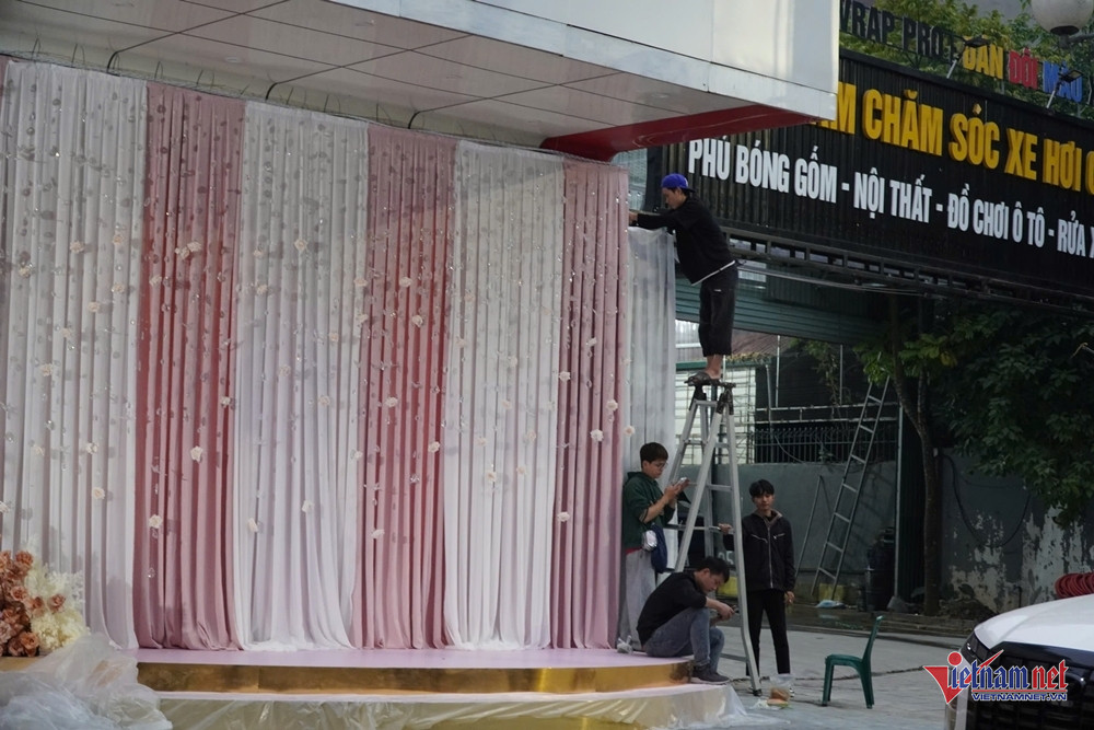 Các công đoạn trang trí, sắp xếp vẫn đang được gấp rút hoàn thiện. Một thợ trang trí cho biết họ sẽ làm việc xuyên đêm để kịp tiến độ cho ngày mai. Gia đình cũng thông báo và nhờ các hộ dân xung quanh tạo điều kiện về việc để xe cộ trong khu vực.