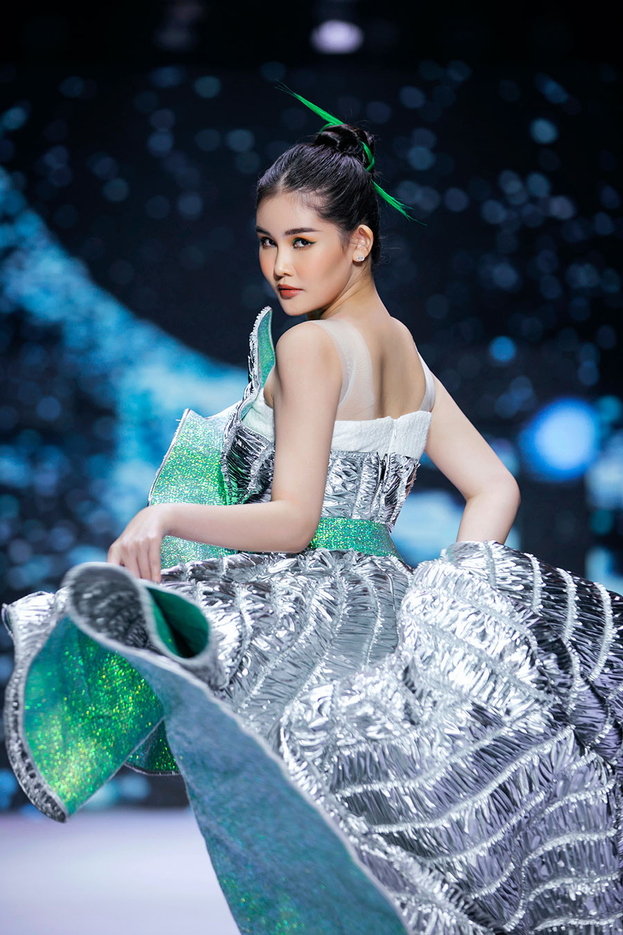 Với chiếc đầm ánh bạc, cô cùng các mẫu nhí nhận được sự cổ vũ của khán giả với màn trình diễn bắt mắt. Đây là lần tái ngộ khán giả sau khi người đẹp tập trung vào công việc giảng dạy của mình tại một trường đại học.