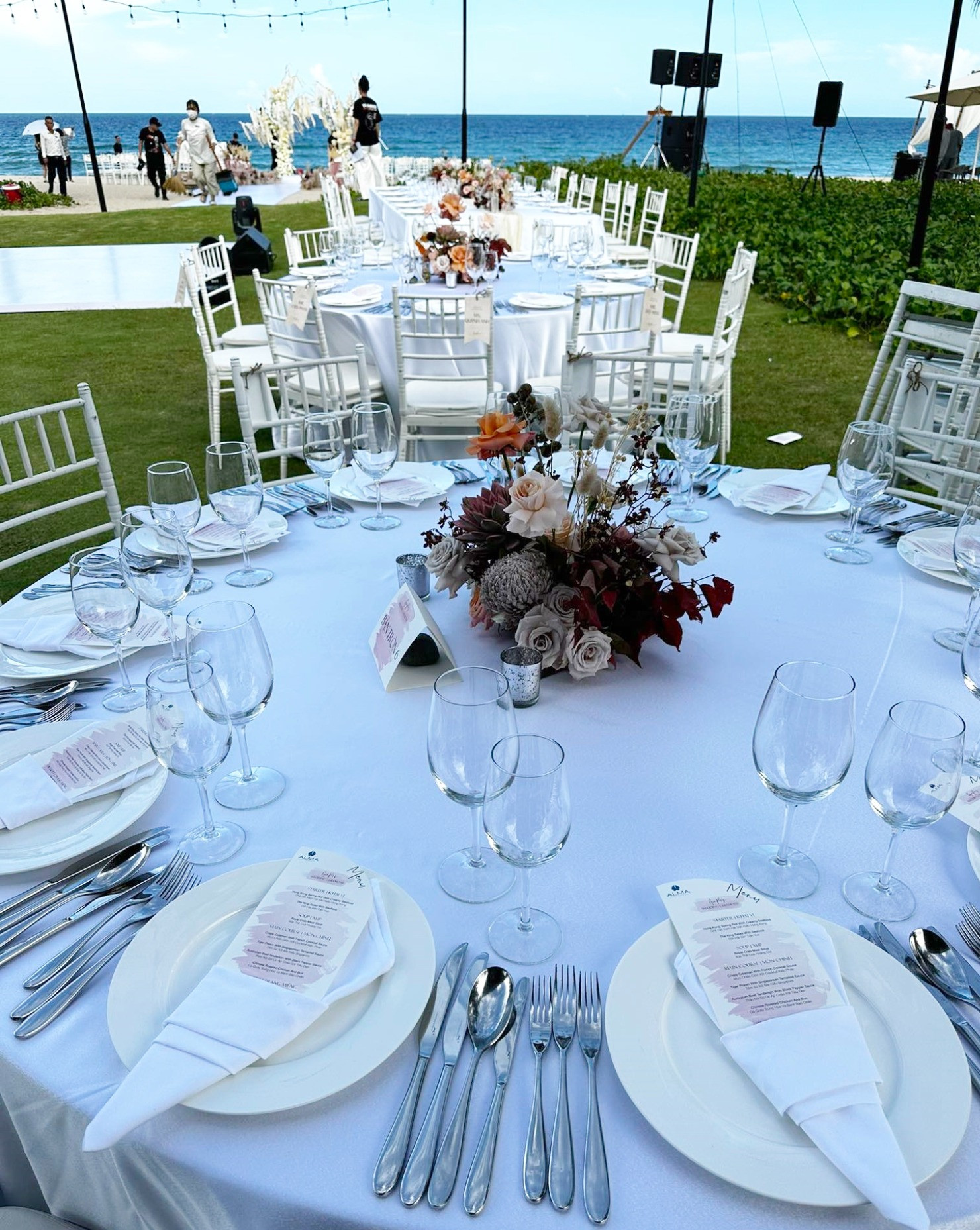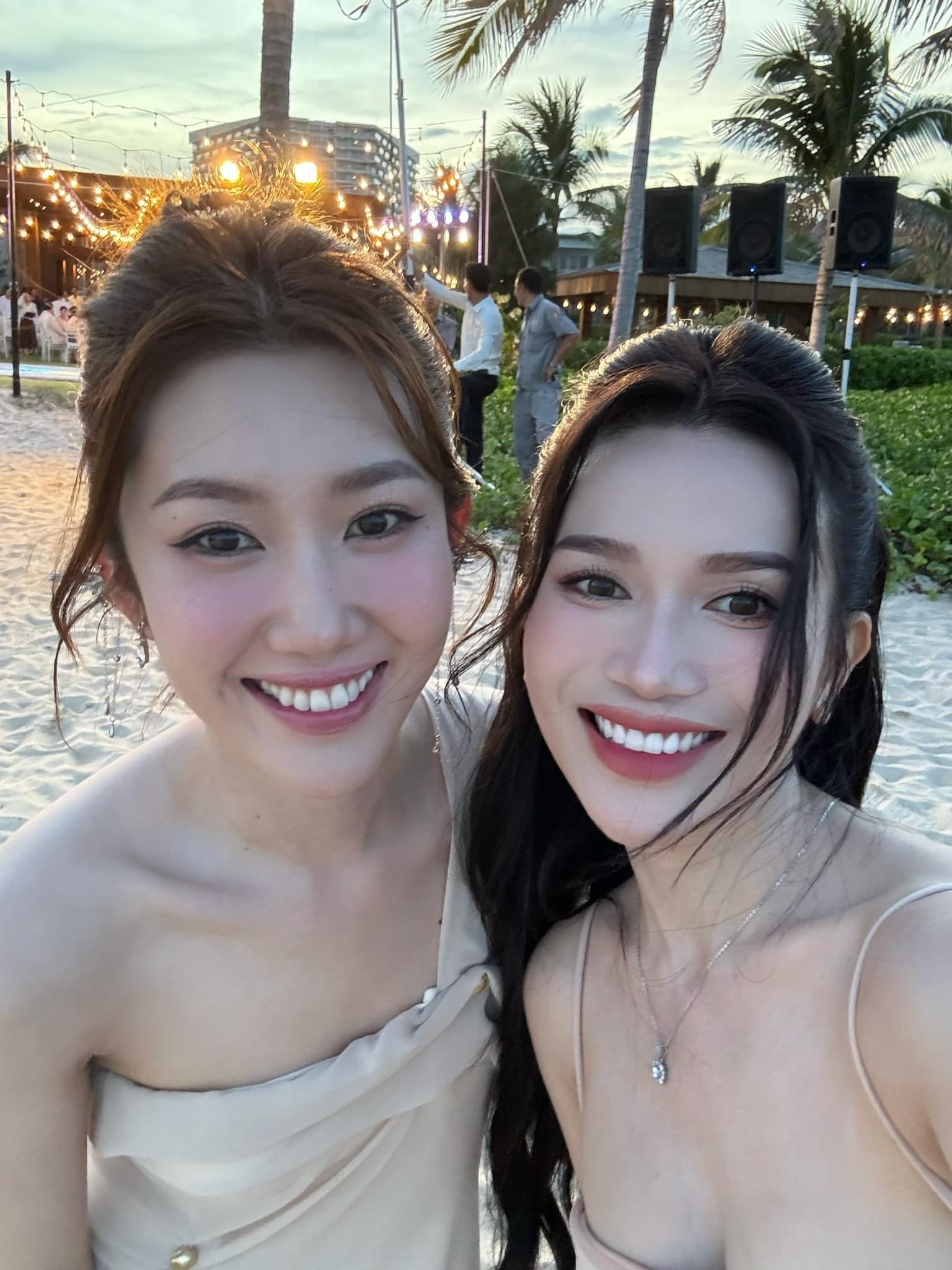 Không gian tiệc cưới ngoài bãi biển vô cùng thoáng đãng, dễ chịu. Bữa tiệc có tông chủ đạo màu trắng. Tên khách mời được gắn sẵn tại mỗi vị trí của bàn tiệc. Trương Thế Vinh, ca sĩ Anh Tú, Lyly cùng nhau chúc mừng cho cặp đôi Puka, Gin Tuấn Kiệt.Chú rể Gin Tuấn Kiệt hồi hộp trước khi vào đón cô dâu. Theo tiết lộ của bạn chú rể, Gin Tuấn Kiệt sẽ có 1 tiết mục đặc biệt tặng cho cô dâu trong ngày trọng đại của cuộc đời.Ngô Kiến Huy, Gil Lê và hội bạn thân selfie cùng cô dâu, chú rể trong bữa tiệc. Ca sĩ Hòa Minzy diện đầm điệu đà khoe sắc vóc ngọt ngào trong lễ cưới của Puka và Gin Tuấn Kiệt.