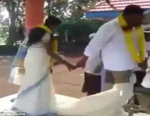 Quan khách tới dự lễ cưới đã được phen cười "rách" miệng khi cô dâu vô tình giẫm tụt chiếc váy truyền thống của chú rể.