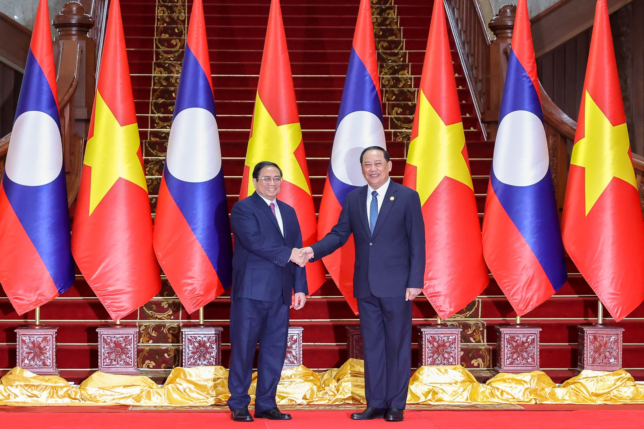 Kết thúc lễ đón chính thức, Thủ tướng Sonexay Siphandone mời Thủ tướng Phạm Minh Chính và các đại biểu đoàn Việt Nam vào Phủ Thủ tướng Lào dự hội đàm.